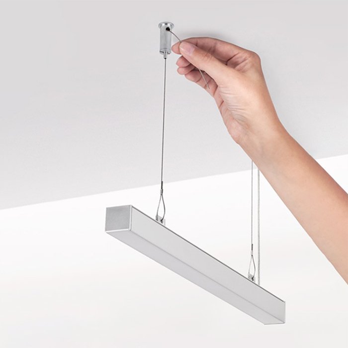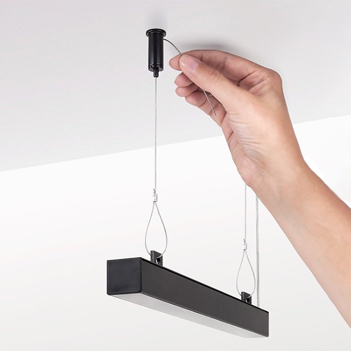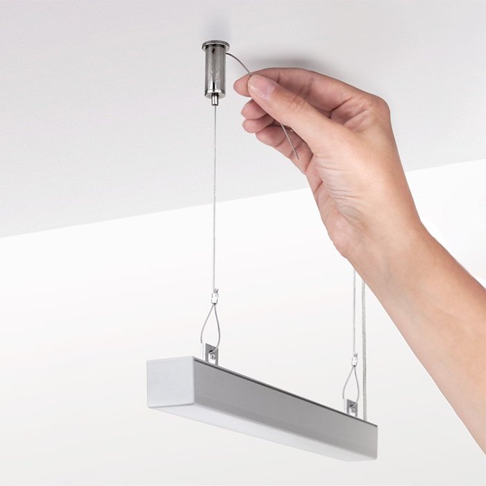 Die individuelle Fertigung von Leuchten mit einer Aufhängung mittels eines kompatiblen Stahlseils bietet Freiheit beim Designen von Leuchten und ihrer Platzierung im Raum, ohne dass der ästhetische Eindruck beeinträchtigt wäre. Für diese Art der Installation von Leuchten können Sie kompatible Aufhängeelemente für Leuchten (Profile | Leisten) bei Verwendung eines Stahlseils verwenden.