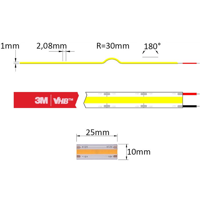 Auch das zugrunde liegende Material und die Struktur wurden sorgfältig ausgewählt. Der COB LED-Streifen 12V mit IP68 und der Bezeichnung: COB-SC24480, ist auf einer gedruckten PCB (Printed Circuit Board) Verbindung mit einer Breite von 10mm, teilbar alle 2,5cm und einem Kupferanteil von 2OZ aufgebaut.