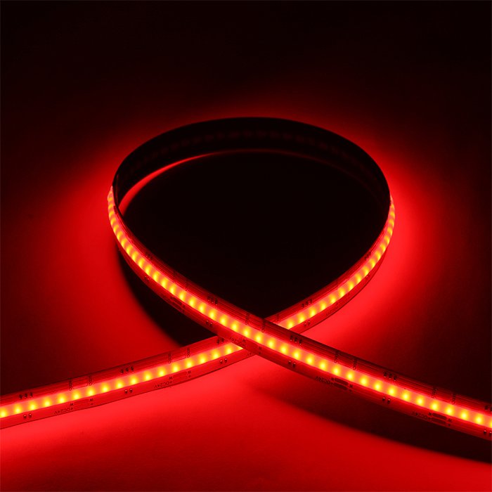 Der RGBW COB LED-Streifen 24V mit der Produktbezeichnung COB-RGBW24896 ist ein Produkt mit erstklassigen Lichtparametern. Ein Vorteil der Technologie RGBW (Rot, Grün, Blau und Weiß) ist die Möglichkeit, ein breites Farbspektrum zu schaffen, einschließlich der Einbeziehung der reinen weißen Lichtkomponente, wodurch eine bessere Farbgenauigkeit und Konsistenz erreicht werden können. Eine Selbstverständlichkeit ist die Möglichkeit, das RGB-Spektrum zu dimmen oder gänzlich auszuschalten und lediglich die weiße Lichtkomponente zum Beleuchten zu verwenden. Charakteristisch für die COB (Chip On Board) Ausführung ist die Unterbringung einer großen Menge an LED-Chips dicht nebeneinander mit dem Ziel, eine durchgehende Lichtlinie zu erzielen. Der gleichmäßige Lichtstrom ohne sichtbare Lichtpunkte ist ein wichtiger Vorteil dieses Produkts. Ab dem ersten technischen Entwurf bis zum Endprodukt wurde Wert darauf gelegt, dass sein Wirkungsgrad (lm/W), die Produktverarbeitung und das Design entsprechende Qualitätsstandards erfüllen. Zusammen mit weiteren Komponenten dient der 24V COB RGBW-Streifen zur Fertigung individueller Leuchten.