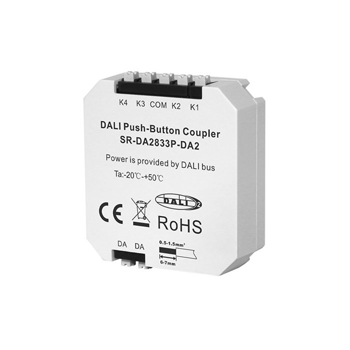 Der DALI-2-Konverter eines PUSH-DIM Tastensignals mit der Bezeichnung SR-DA2833P-DA2 ist eine ideale Lösung für die Modernisierung älterer Beleuchtungssysteme und für die Integration konventioneller Steuerungselemente in Gebäudeautomationslösungen.