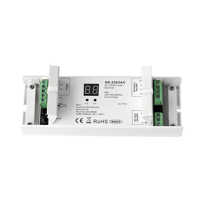 Der DALI 2-Kanal Dimmer 230V für LED-Leuchten mit der Bezeichnung SR-2303AC ist ein erstklassiges elektronisches Produkt für das Dimmen von Leuchten, LED-Birnen und weiteren Geräten mithilfe eines DALI-Protokolls. Er ermöglicht die Integration in Gebäudeautomationssysteme mithilfe eines DALI-Protokolls mit der Möglichkeit des Steuerns von einem oder zwei Kanälen mithilfe einer oder zwei zugeordneter DALI-Adressen. Der DALI-Dimmer 230V SR-2303AC unterstützt das Trailing Edge Dimming (Phasenabschnittdimmen). Die modernen Funktionen und die fortschrittlichen elektronischen Elemente ermöglichen zudem das Einstellen einer minimalen Helligkeit der Beleuchtung.