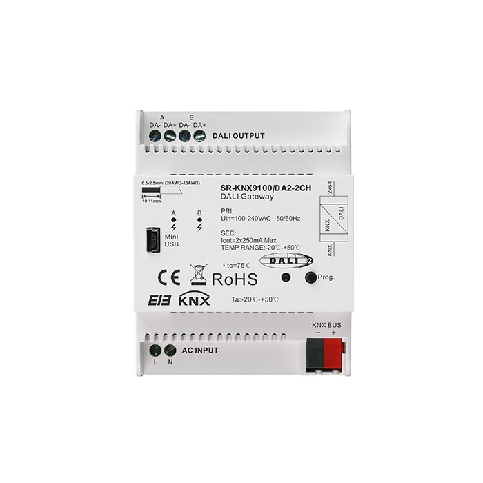 Das KNX DALI Gateway mit der Bezeichnung SR-KN9100-DA2-2CH ist ein erstklassiges elektronisches Produkt für die Integration von Beleuchtungssystemen, die ein DALI-Protokoll (Digital Addressable Lighting Interface) nutzen, in ein KNX-System (Gebäudeautomationsstandard). Das Gerät verfügt über zwei Kanäle mit eingebauten DALI BUS Netzteilen, die ein einfaches Konfigurieren und Managen der Beleuchtungsfunktionen per Windows-App bieten.