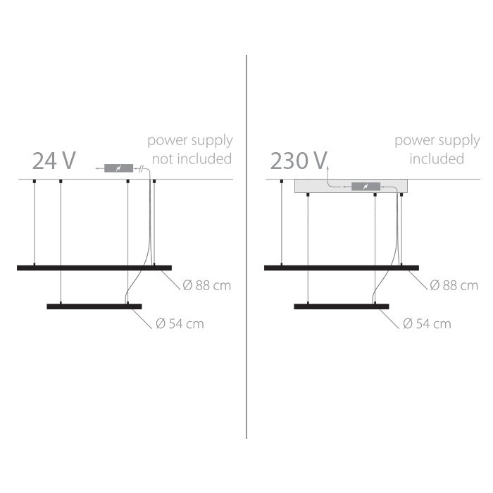 - DC 24V - die Leuchte wird ohne Netzteil geliefert. Ein passendes Netzteil ist separat zu erwerben und in einem Stromverteiler oder an einer anderen geeigneten Stelle je nach Installation zu platzieren