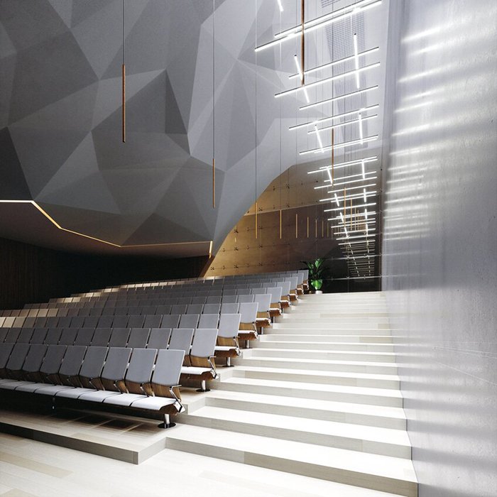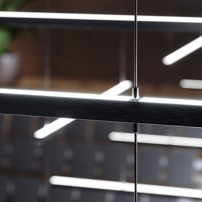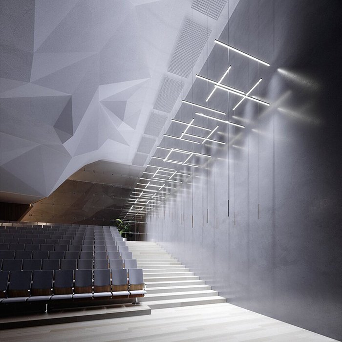 - Kaskadenaufhängung von Leuchten - lineare Leuchten, die kettenartig in Kaskaden- oder Zick-Zack-Formen aufgehängt sind.