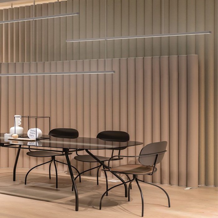- Lineare Deckenbeleuchtung mit indirekter Beleuchtung der Decke - in Form einer abgehängten minimalistischen Leuchte mit zwei Leuchtrichtungen.