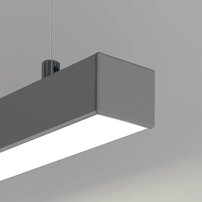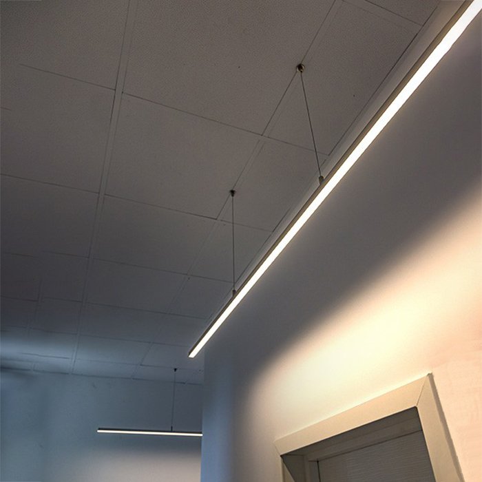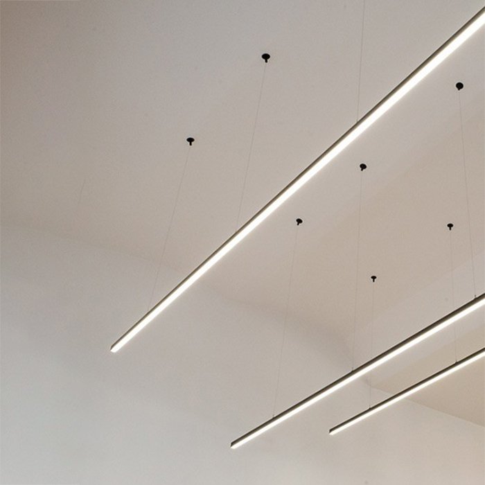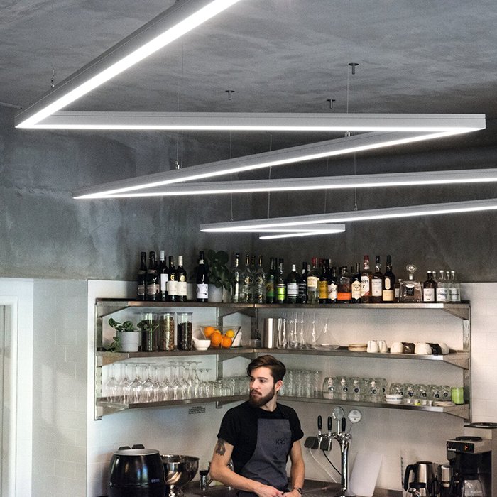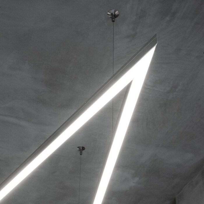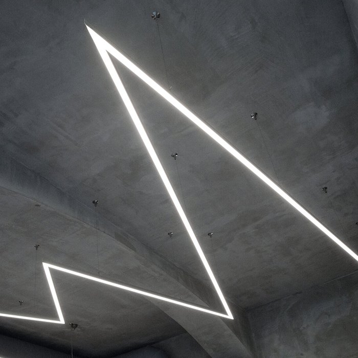 - Lineare Beleuchtung mit polygonalen Formen - in Form einer abgehängten oder aufgesetzten leistungsstarken Leuchte.