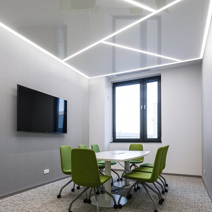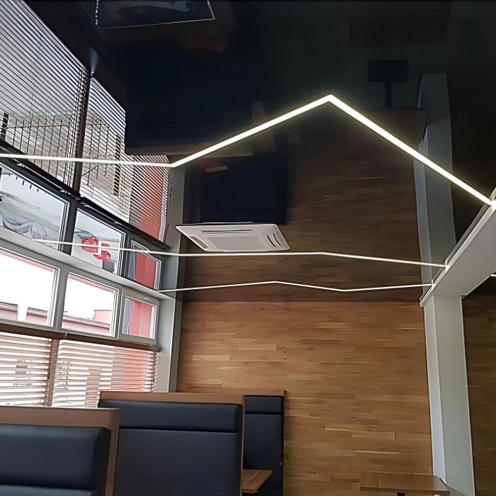 - Lineare Leuchte polygonaler Formen - in Form einer aufgesetzten Leuchte umlaufend um eine Spanndecke aus Folie.