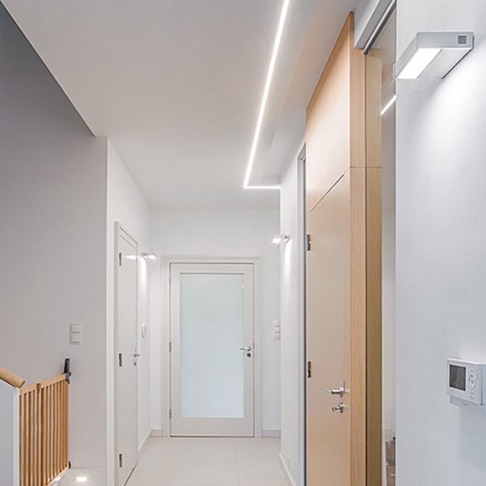 Wenn Sie nach einer Möglichkeit suchen, eine leistungsstarke Wandbeleuchtung mit LED-Streifen in Form einer aufgesetzten linearen Leuchte zu schaffen, dann kann das Alu-Profil KIDES eine ideale Alternative für Sie sein. Es sorgt für eine kompakte ästhetische Optik und hervorragende Lichteigenschaften je nach Konfiguration der Leuchte. Das Produktdesign prädestiniert es für eine Verwendung als: