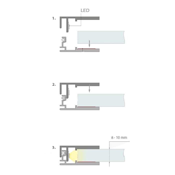 Bei der Wahl der Lichtquelle aus der Produktkategorie LED-Streifen und Lichtbänder spielen die unten genannten technischen Eigenschaften eine wichtige Rolle. Die Einhaltung der technischen und der Konstruktionsempfehlungen ist für die Qualität und einen langen Lebenszyklus der gefertigten Beleuchtung von großer Bedeutung. Die LED-Alu-Glaskantenleiste ermöglicht: