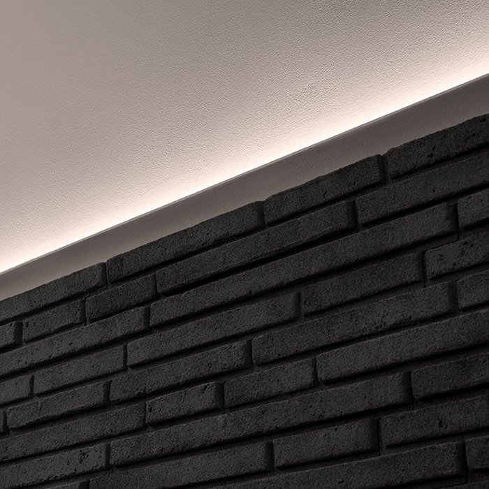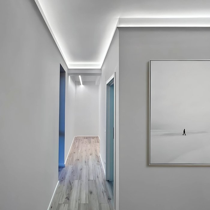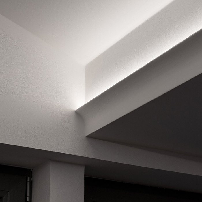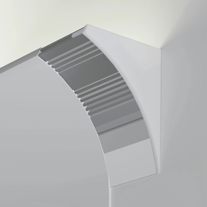 - Effekt des Verschmelzens mit der Oberfläche - die Montage umfasst abschließende Trockenbau- und Malerarbeiten. Dank dessen verschmilzt die Voutenleiste perfekt mit der Oberfläche der Wand und wirkt wie eine LED-Stuckleiste, ist aber dank der Aluminiumausführung stabiler.