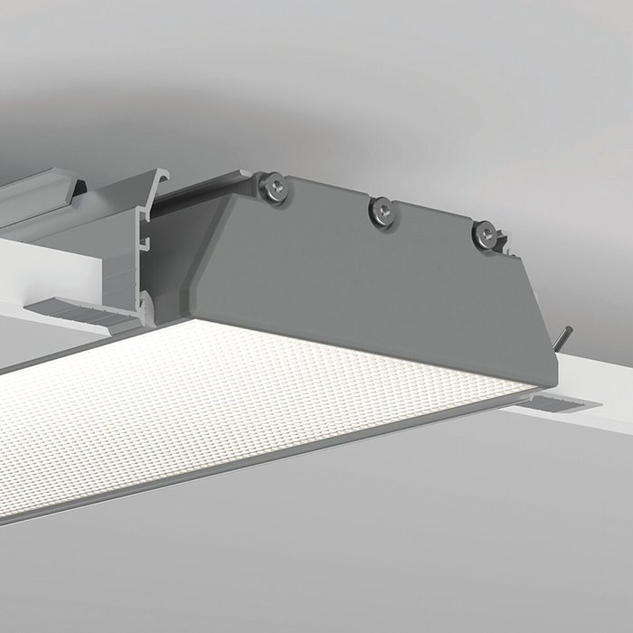- Das LED-Einbauprofil für abgehängte Decken OMODO-100 reicht mit seiner Tiefe in das Raster (die Konstruktion) der Decke hinein.