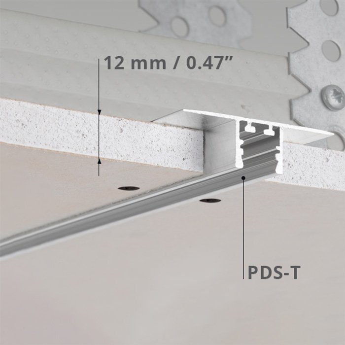 Wenn Sie nach einer Möglichkeit suchen, eine Beleuchtung von Gipskarton mit LED-Streifen in schmalen Lichtlinien zu schaffen, dann kann die Alu-Leiste PDS-T eine ideale Alternative für Sie sein. Sie sorgt für eine kompakte ästhetische Optik und hervorragende Lichteigenschaften je nach Konfiguration der Leuchte. Das Produktdesign prädestiniert sie für eine Verwendung als: