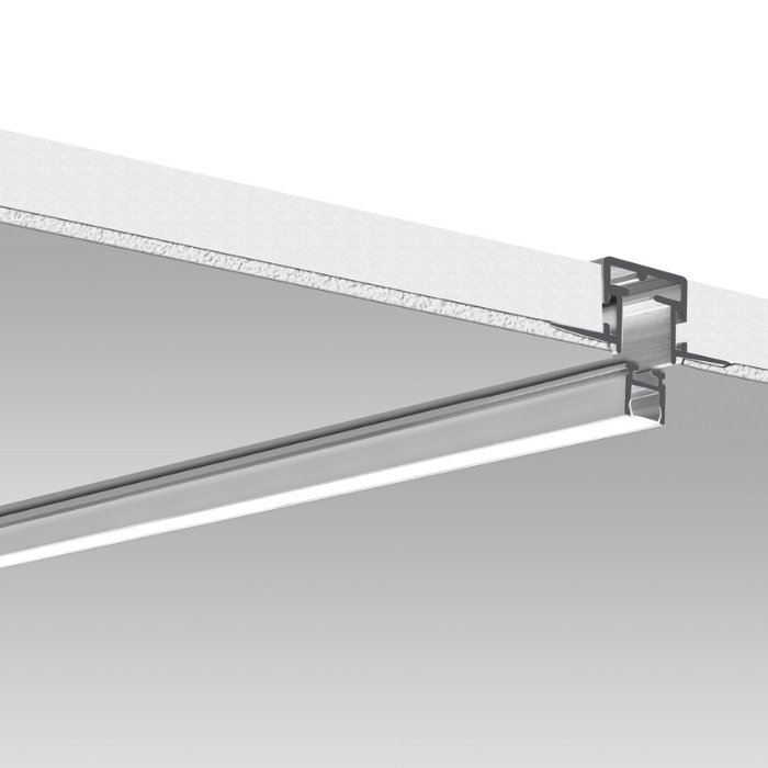 - Anschlusses an eine #tablink#profily#kompatible LED-Schiene## im Trockenbau - mit der Möglichkeit des Übergangs der Lichtlinie von einer abgehängten Decke in den freien Raum.