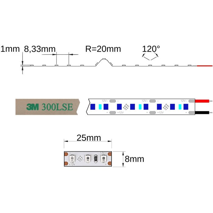 - Anzahl der Dioden auf 1 lfd. Meter 120 LEDs/1m - eine hohe Diodendichte hat einen positiven Einfluss auf das Erzielen einer zusammenhängenden Lichtlinie bei der Fertigung einer Leuchte.