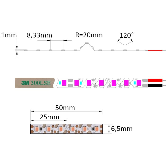 Der flexible LED-Stripe fuchsienfarben 12V SC12120E ist auf seiner Unterseite mit dem doppelseitigen Spezialklebeband 3M 300LSE versehen. Dieses dient zur Montage auf einer gewählten Unterlage (für eine gute Kühlung und den Schutz des Zick-Zack LED-Bands empfehlen wir dringend, LED-Profilleisten zu verwenden). Diese muss glatt und fettfrei sein. Wir empfehlen, den Anschluss des LED-Streifens an die Versorgungsquelle zu löten.