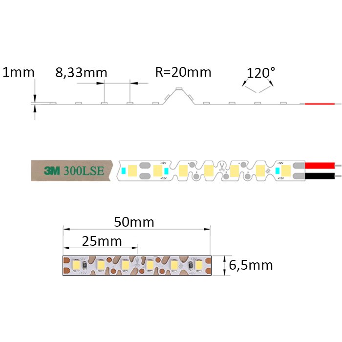 Der flexible LED-Stripe gelb 12V SC12120E ist auf seiner Unterseite mit dem doppelseitigen Spezialklebeband 3M 300LSE versehen. Dieses dient zur Montage auf einer gewählten Unterlage (für eine gute Kühlung und den Schutz des Zick-Zack LED-Bands empfehlen wir dringend, LED-Profilleisten zu verwenden). Diese muss glatt und fettfrei sein. Wir empfehlen, den Anschluss des LED-Streifens an die Versorgungsquelle zu löten.