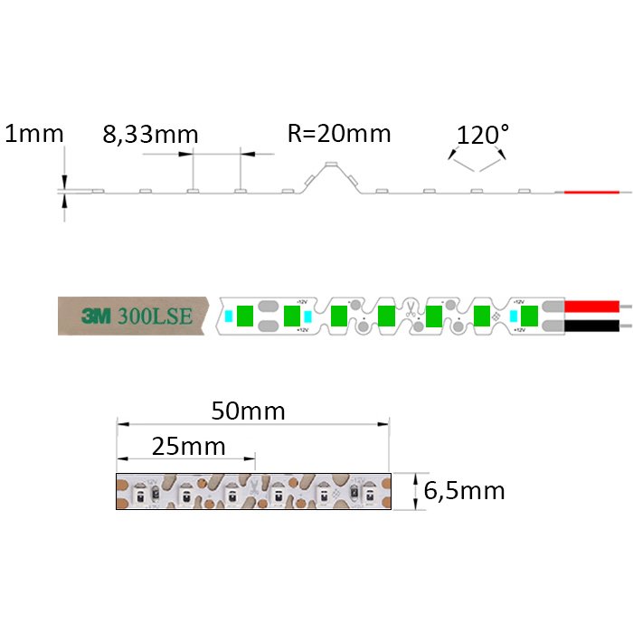 Der flexible LED-Stripe grün 12V SC12120E ist auf seiner Unterseite mit dem doppelseitigen Spezialklebeband 3M 300LSE versehen. Dieses dient zur Montage auf einer gewählten Unterlage (für eine gute Kühlung und den Schutz des Zick-Zack LED-Bands empfehlen wir dringend, LED-Profilleisten zu verwenden). Diese muss glatt und fettfrei sein. Wir empfehlen, den Anschluss des LED-Streifens an die Versorgungsquelle zu löten.