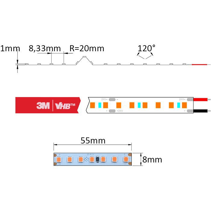 Der LED-Stripe orange 24V SC24126 ist auf seiner Unterseite mit dem doppelseitigen Spezialklebeband 3M VHB versehen. Dieses dient zur Montage auf einer gewählten Unterlage (für eine gute Kühlung und den Schutz des orangen LED-Bands empfehlen wir dringend, LED-Profilleisten zu verwenden). Diese muss glatt und fettfrei sein. Wir empfehlen, den Anschluss des LED-Streifens an die Versorgungsquelle zu löten.