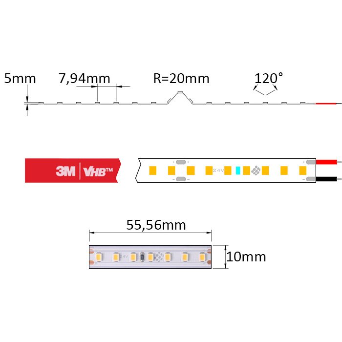 Auch das zugrunde liegende Material und die Struktur wurden sorgfältig ausgewählt. Das 24V LED-Band wasserdicht mit der Bezeichnung SC24126 ist auf einer Leiterplatte (Printed Circuit Board) mit einer Breite von 10mm (einschließlich transparentem Gehäuse), teilbar alle 5,5cm, und einem Kupferanteil von 3OZ aufgebaut. Der hohe Anteil von 3OZ Kupfer bei der Produktion sorgt für:
