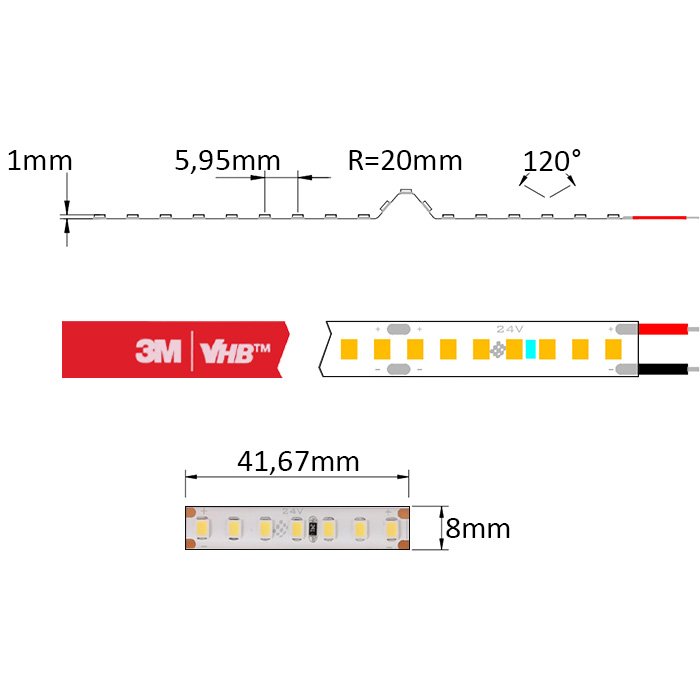 Der wasserfeste LED-Stripe weiß 24V SC24168 ist auf seiner Unterseite mit dem doppelseitigen Spezialklebeband 3M VHB versehen. Dieses dient zur Montage auf einer gewählten Unterlage (für eine gute Kühlung und den Schutz des LED-Bands IP65 empfehlen wir dringend, LED-Profilleisten zu verwenden). Diese muss glatt und fettfrei sein. Wir empfehlen, den Anschluss des LED-Streifens an die Versorgungsquelle zu löten.