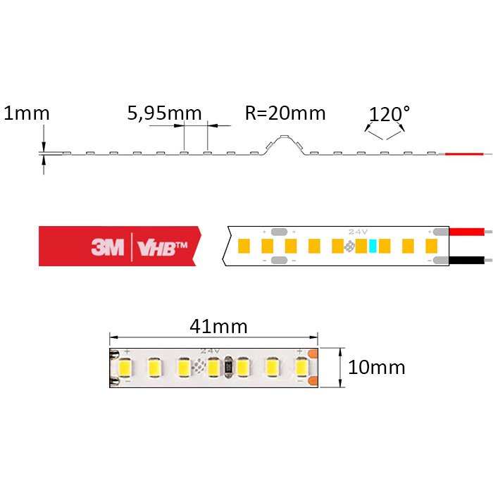 Der LED-Stripe weiß 24V SC24168 ist auf seiner Unterseite mit dem doppelseitigen Spezialklebeband 3M VHB versehen. Dieses dient zur Montage auf einer gewählten Unterlage (für eine gute Kühlung und den Schutz des LED-Bands empfehlen wir dringend, LED-Profilleisten zu verwenden). Diese muss glatt und fettfrei sein. Wir empfehlen, den Anschluss des LED-Streifens an die Versorgungsquelle zu löten.