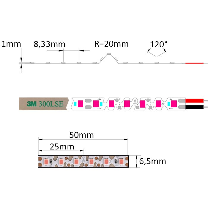 Der flexible LED-Stripe rosa 12V SC12120E ist auf seiner Unterseite mit dem doppelseitigen Spezialklebeband 3M 300LSE versehen. Dieses dient zur Montage auf einer gewählten Unterlage (für eine gute Kühlung und den Schutz des Zick-Zack LED-Bands empfehlen wir dringend, LED-Profilleisten zu verwenden). Diese muss glatt und fettfrei sein. Wir empfehlen, den Anschluss des LED-Streifens an die Versorgungsquelle zu löten.