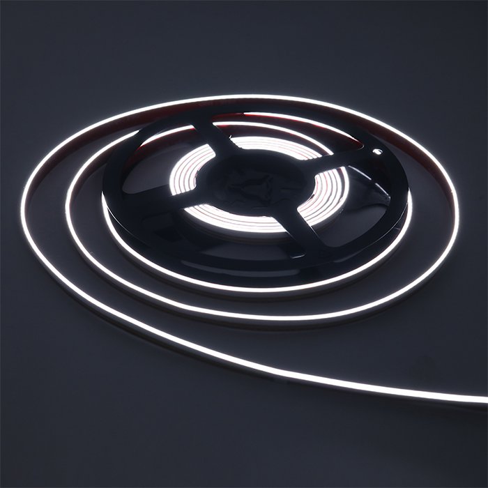Der seitlich abstrahlende LED-Streifen weiß 24V mit der Produktbezeichnung COB-SC24320 ist ein Produkt mit erstklassigen Lichtparametern und mechanischen Eigenschaften. Er zeichnet sich durch eine seitliche Abstrahlung und die minimalistische, extra schmale Breite von 8mm sowie durch die Möglichkeit des Kürzens an jeder beliebigen Stelle aus. Die verwendete Technologie COB (Chip On Board) ermöglicht es, eine große Menge an LED-Chips in einer zusammenhängenden Beleuchtungslinie unterzubringen. Der gleichmäßige Lichtstrom ohne sichtbare Lichtpunkte gehört zu den größten Vorteilen dieses Produkts, das lediglich weißes Licht in den angebotenen Farbtemperaturen ausstrahlt. Ab dem ersten technischen Entwurf bis zum Endprodukt wurde Wert darauf gelegt, dass sein Wirkungsgrad (lm/W), die Produktverarbeitung und das Design entsprechende Qualitätsstandards erfüllen. Zusammen mit weiteren Komponenten dient er zur Fertigung individueller Leuchten.