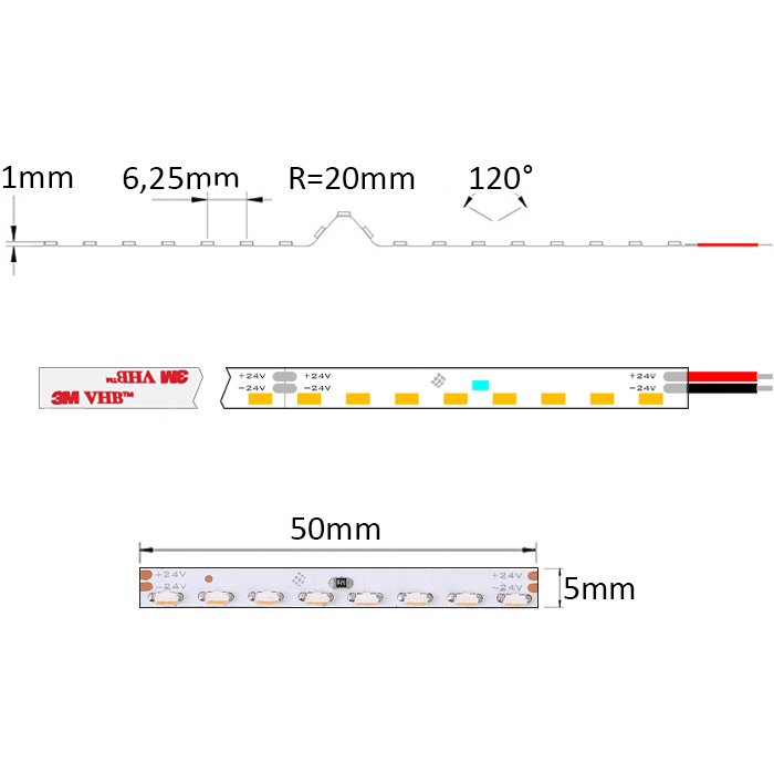 Der seitlich abstrahlende LED-Stripe weiß 24V SC24160 ist auf seiner Unterseite mit dem doppelseitigen Spezialklebeband 3M VHB versehen. Dieses dient zur Montage auf einer gewählten Unterlage (für eine gute Kühlung und den Schutz des SIDE LED-Bands empfehlen wir dringend, LED-Profilleisten zu verwenden). Diese muss glatt und fettfrei sein. Wir empfehlen, den Anschluss des LED-Streifens an die Versorgungsquelle zu löten.