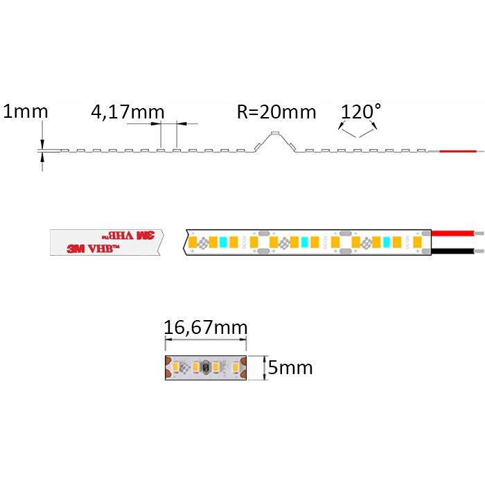 Der MINI LED-Stripe weiß 12V SC12240 ist auf seiner Unterseite mit dem doppelseitigen Spezialklebeband 3M VHB versehen. Dieses dient zur Montage auf einer gewählten Unterlage (für eine gute Kühlung und den Schutz des SLIM LED-Bands empfehlen wir dringend, LED-Profilleisten zu verwenden). Diese muss glatt und fettfrei sein. Wir empfehlen, den Anschluss des LED-Streifens an die Versorgungsquelle zu löten.