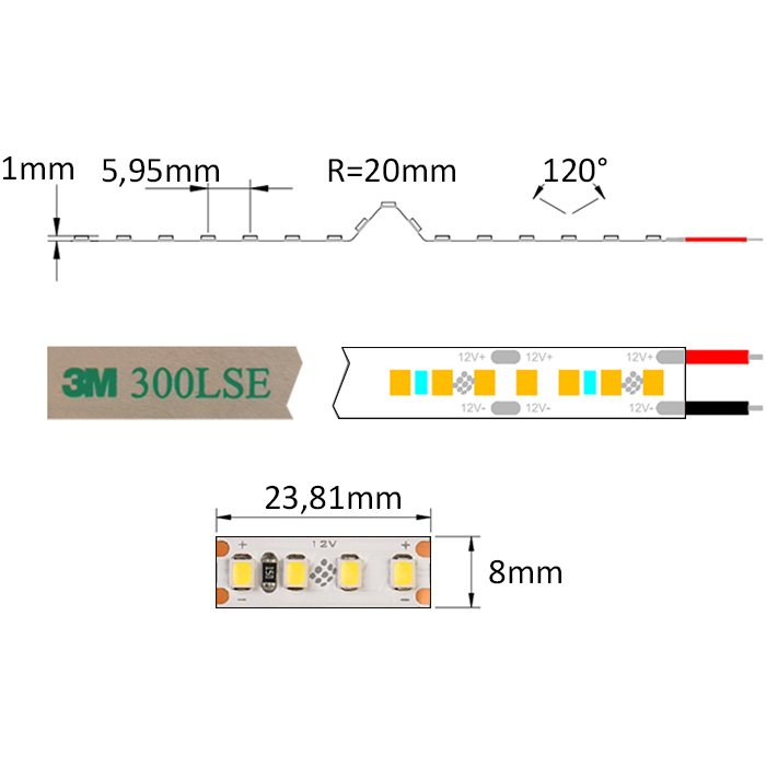 Der LED-Stripe weiß 12V SC12168 ist auf seiner Unterseite mit dem doppelseitigen Spezialklebeband 3M 300LSE versehen. Dieses dient zur Montage auf einer gewählten Unterlage (für eine gute Kühlung und den Schutz des LED-Bands empfehlen wir dringend, LED-Profilleisten zu verwenden). Diese muss glatt und fettfrei sein. Wir empfehlen, den Anschluss des LED-Streifens an die Versorgungsquelle zu löten.