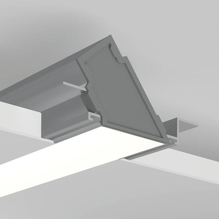 - Möglichkeit der Schaffung einer gerichteten Deckenbeleuchtung ohne sichtbaren Rahmen rund um das eingebaute Profil im Gipskarton.