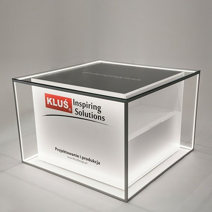 Der KLUŚ Ausstellungstisch ermöglicht eine einfache, attraktive und effektive Präsentation von Produkten. Der Tisch ist mit einer Elektroinstallation, mit der Möglichkeit des Anschlusses an eine 230V-Steckdose, ausgestattet.