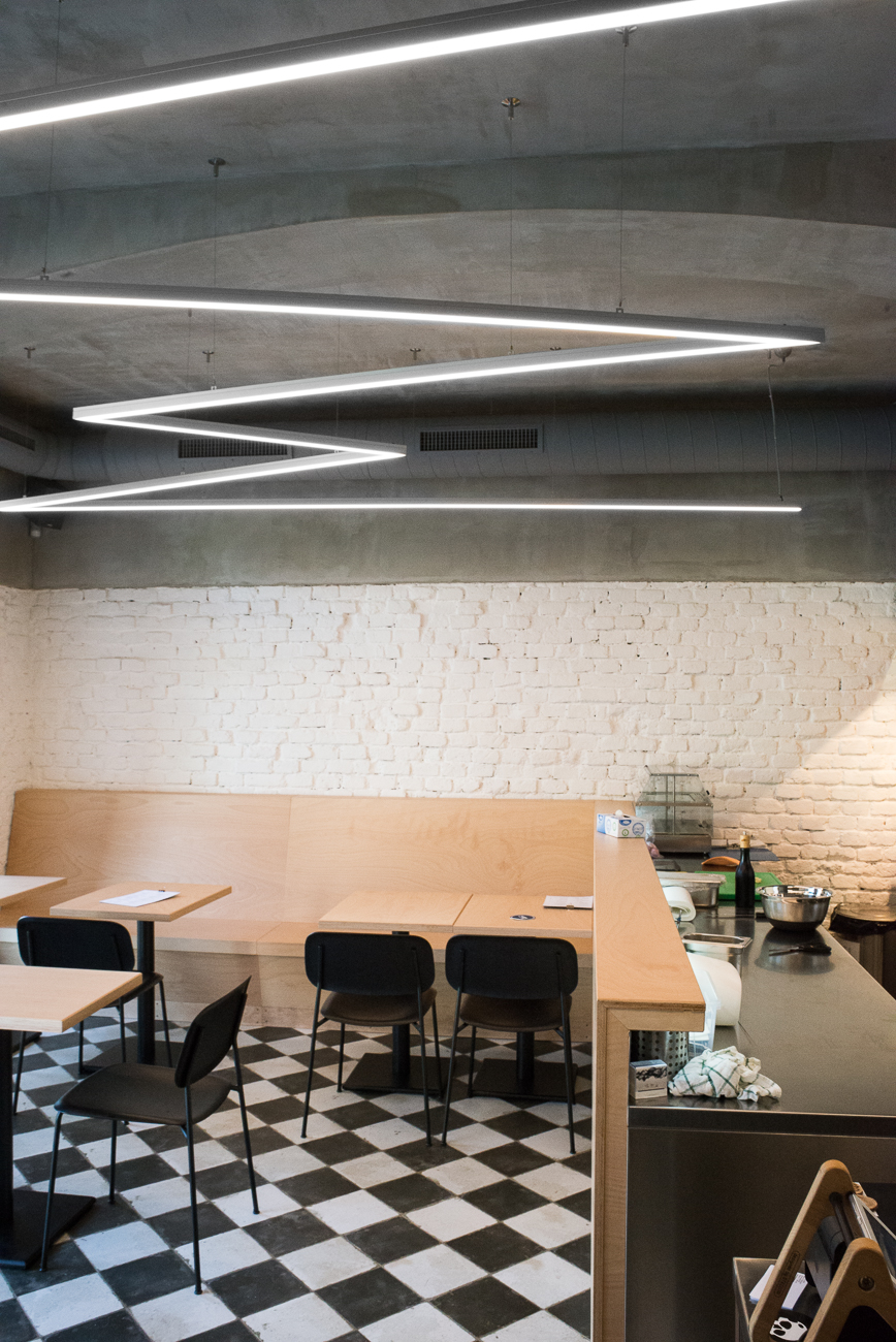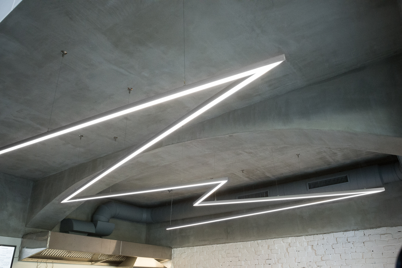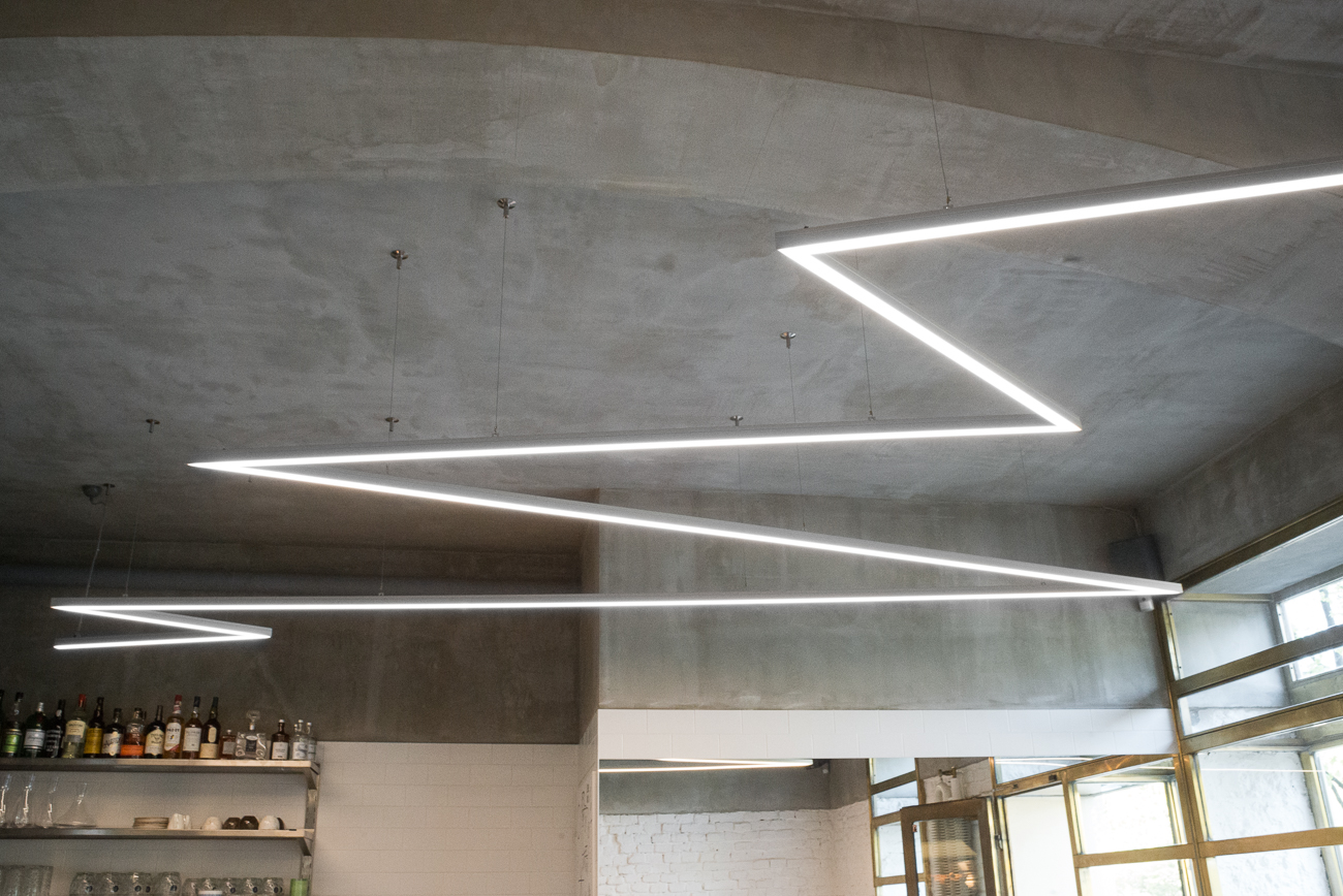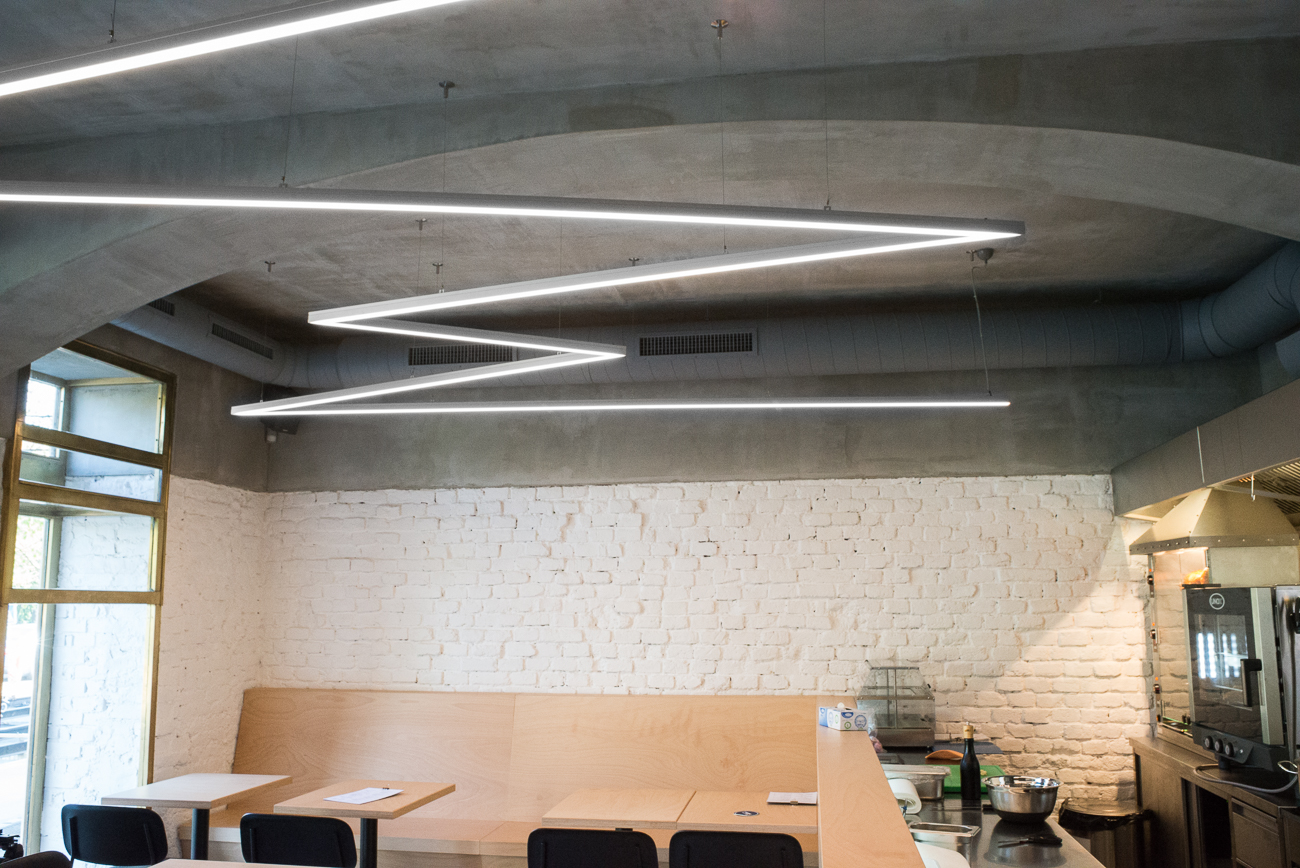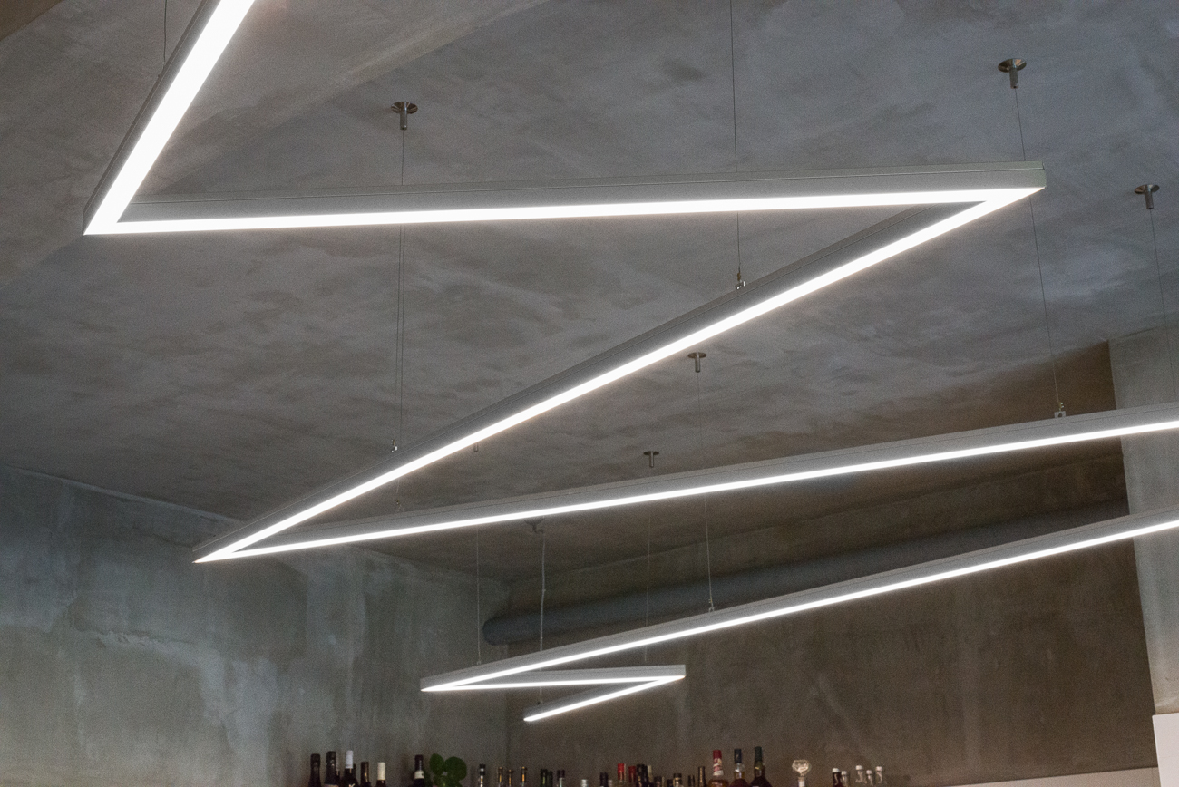 Dieses Bistro wird mittels eines Profils in Blitzform beleuchtet, wobei das LED-ALU-Deckenprofil KLUS 3035 verwendet wurde. Zu seinen Vorteilen gehören die Möglichkeit des Auf- und Abhängens von einer Decke (in horizontaler Richtung) als auch das Aufsetzen auf eine Oberfläche (in horizontaler oder vertikaler Richtung) sowie der Hohlraum für eine verdeckte Führung der Versorgungskabel und Stromleitungen.