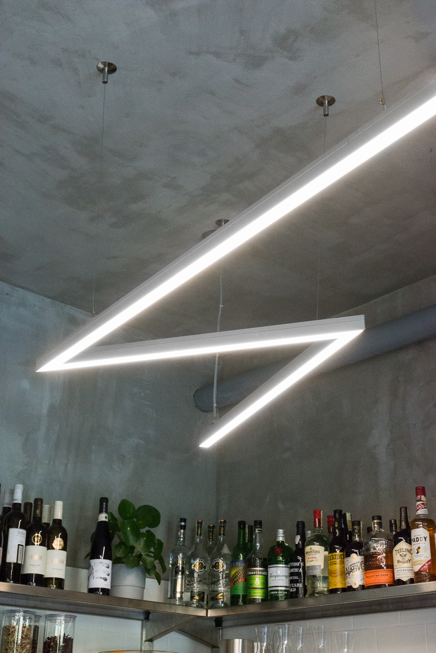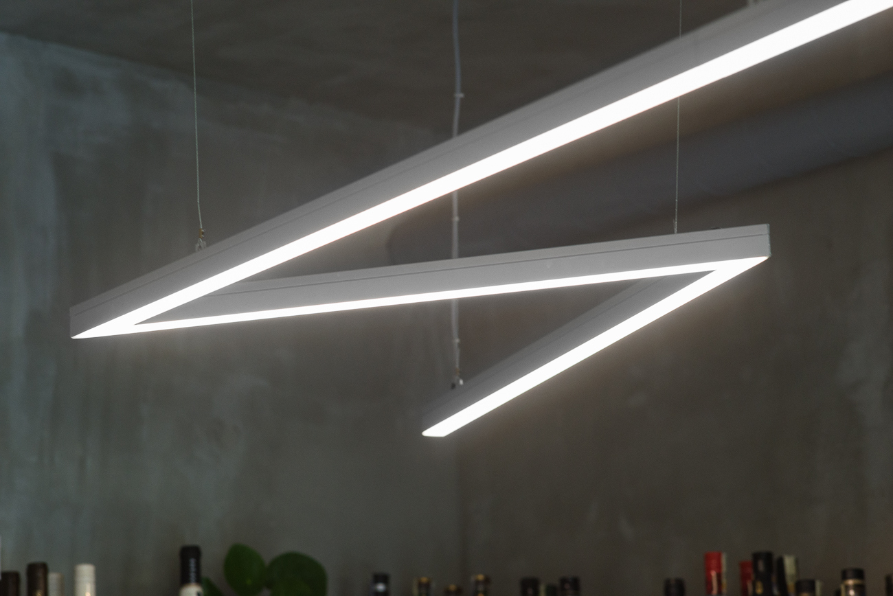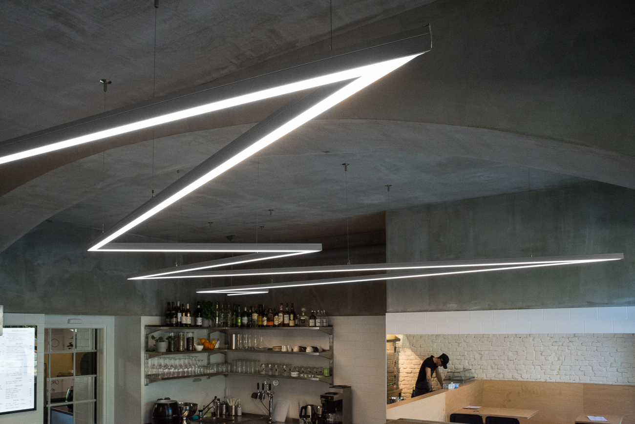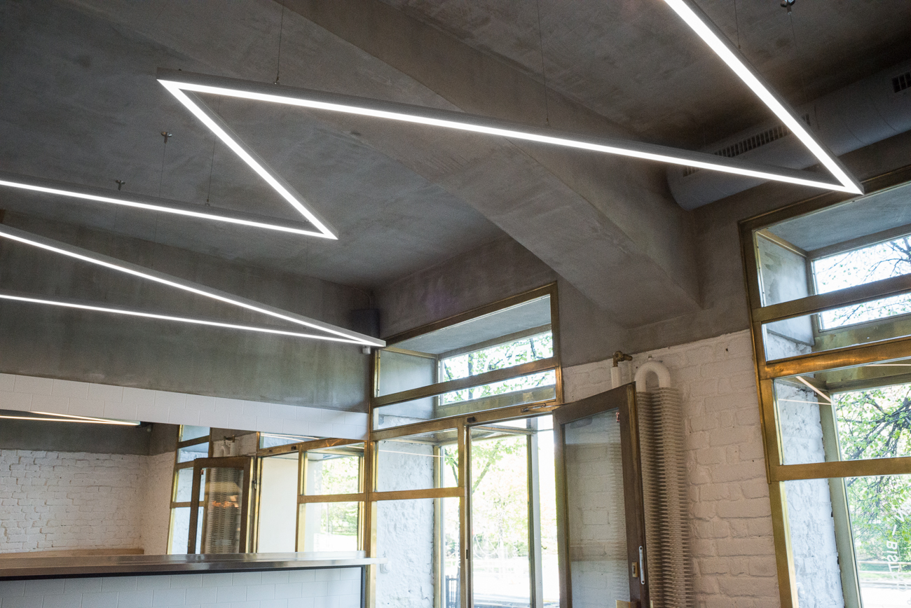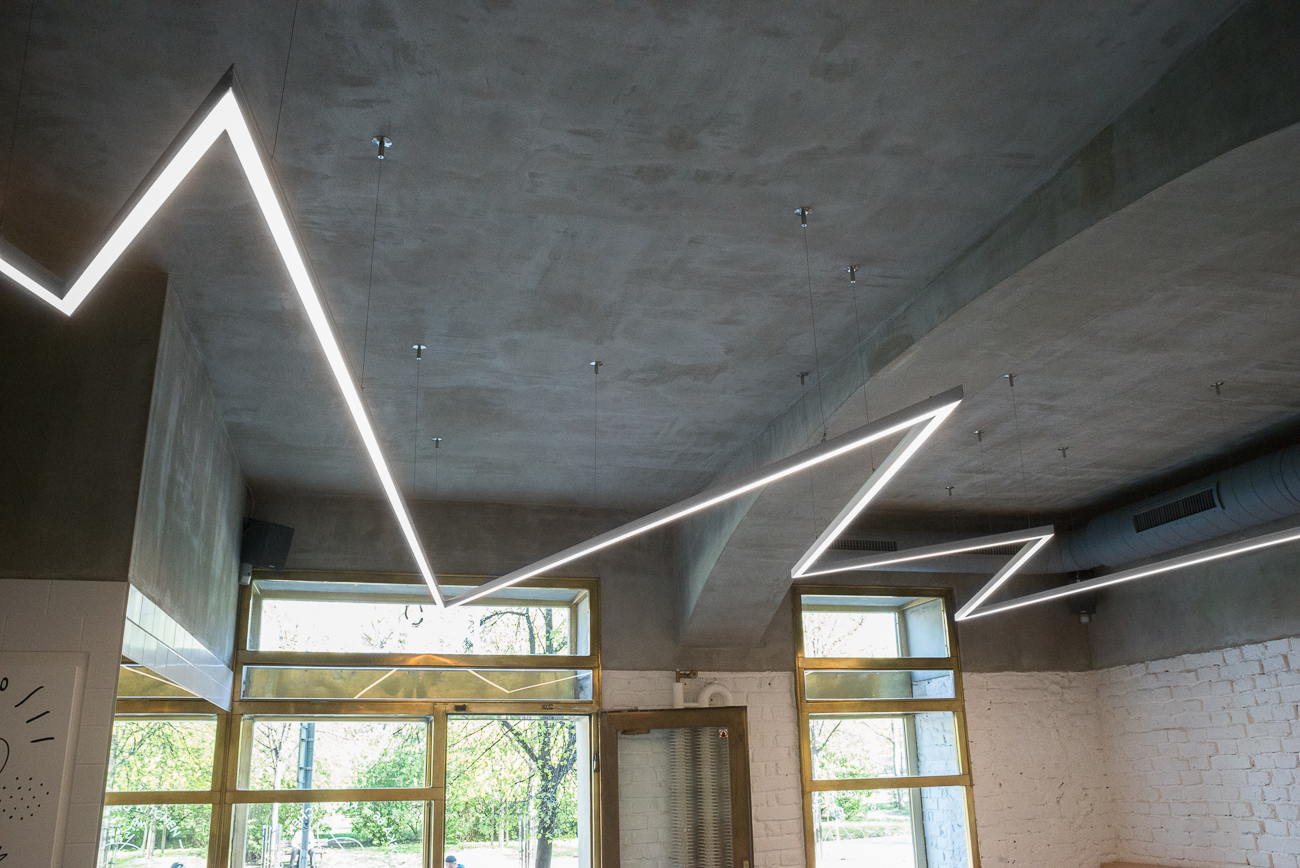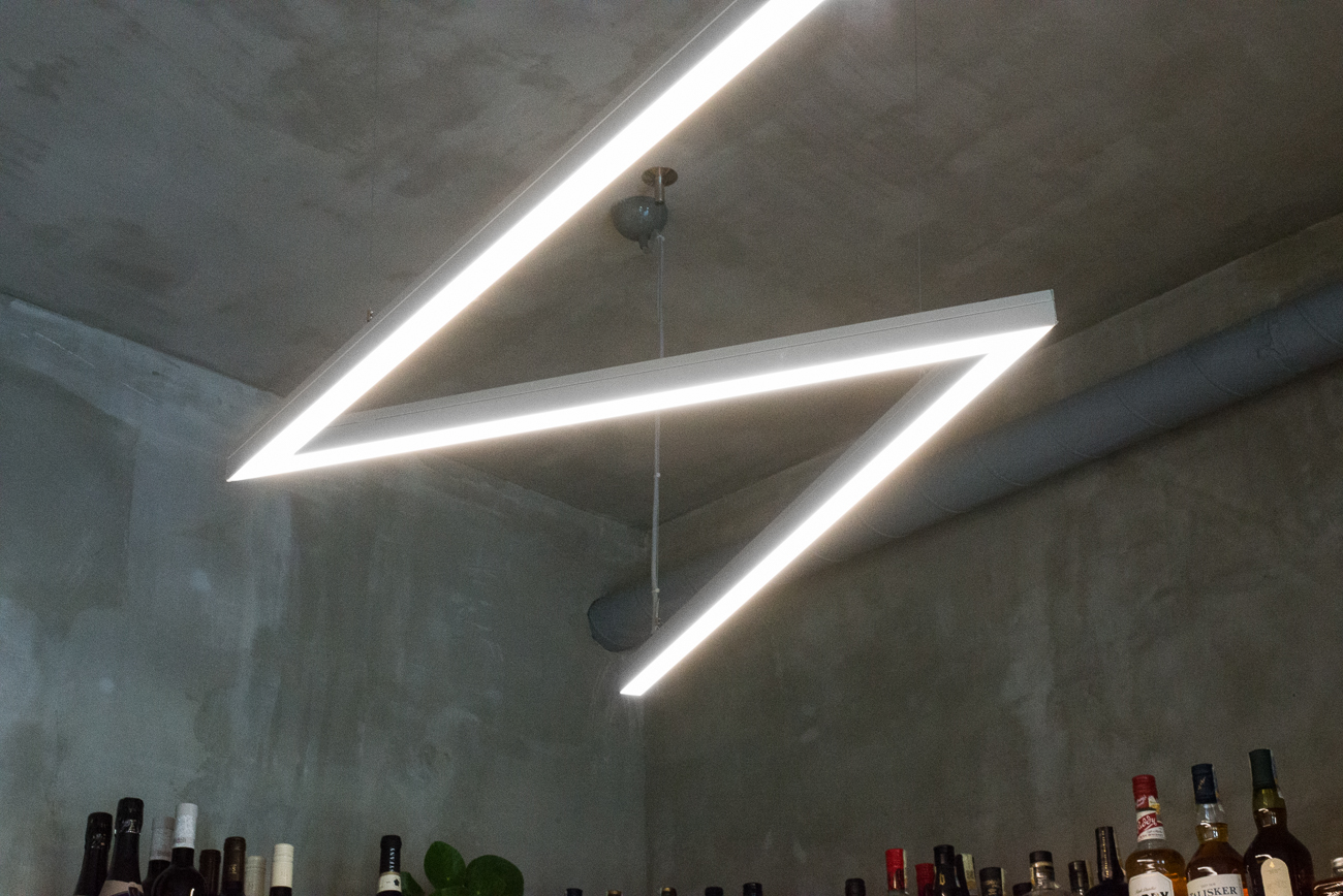 Dieses Bistro wird mittels eines Profils in Blitzform beleuchtet, wobei das LED-ALU-Deckenprofil KLUS 3035 verwendet wurde. Zu seinen Vorteilen gehören die Möglichkeit des Auf- und Abhängens von einer Decke (in horizontaler Richtung) als auch das Aufsetzen auf eine Oberfläche (in horizontaler oder vertikaler Richtung) sowie der Hohlraum für eine verdeckte Führung der Versorgungskabel und Stromleitungen.
