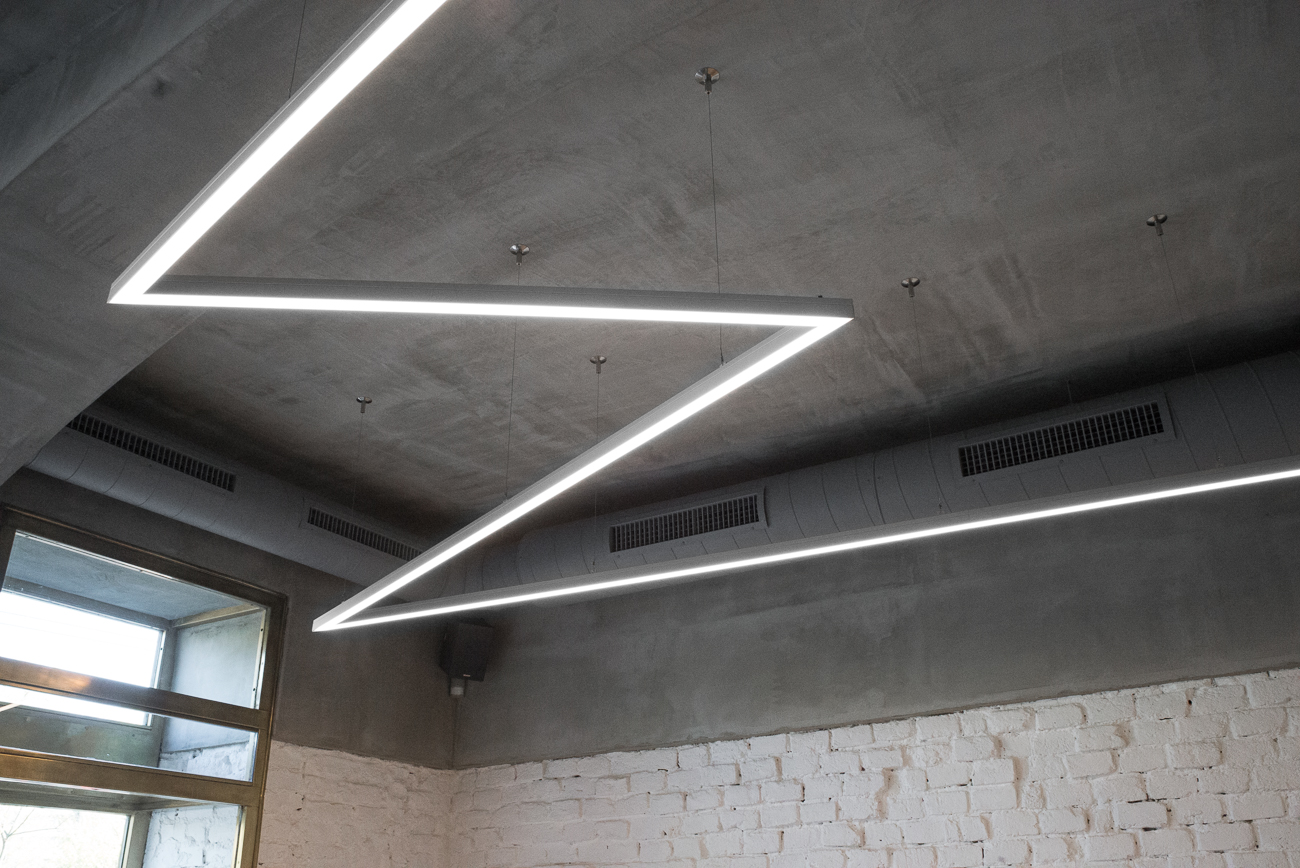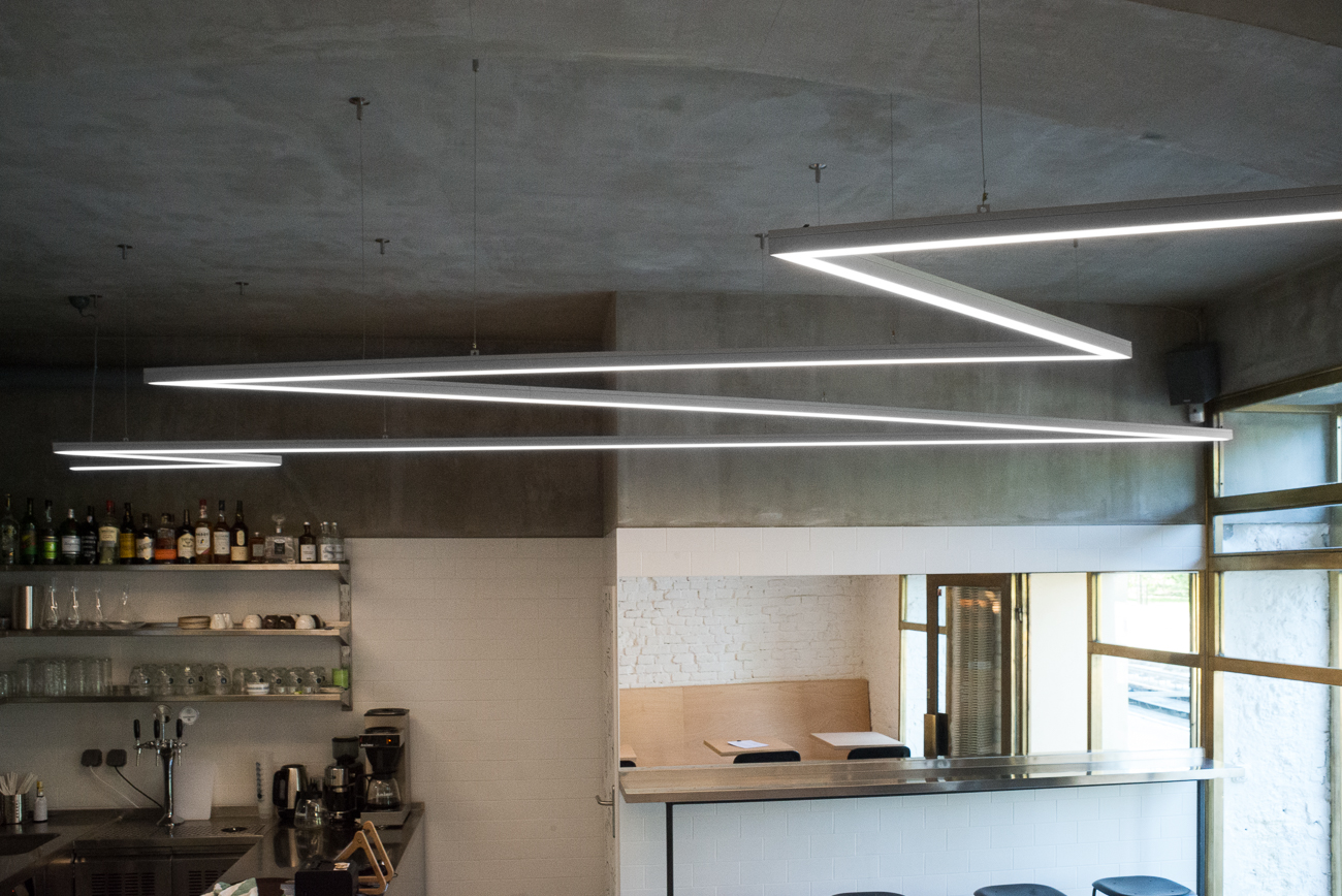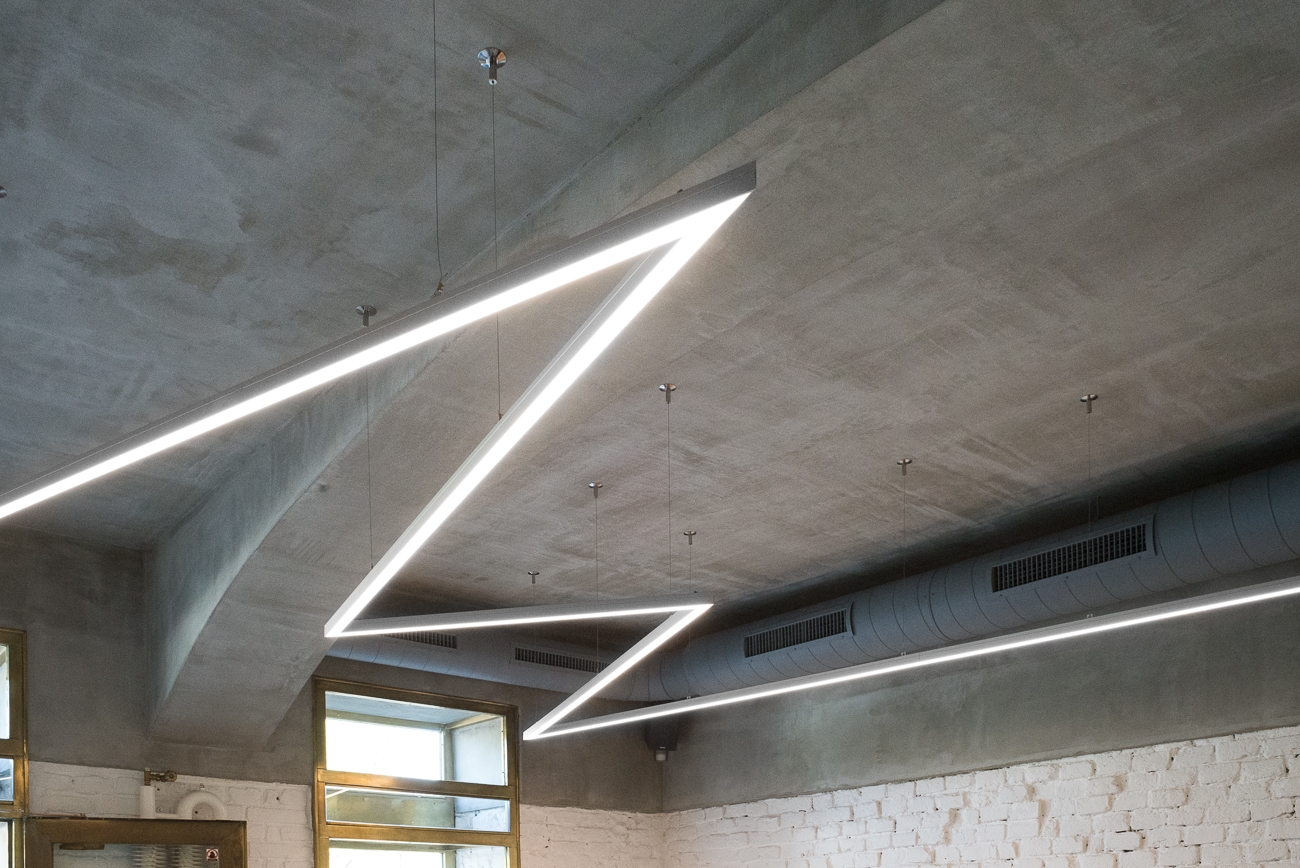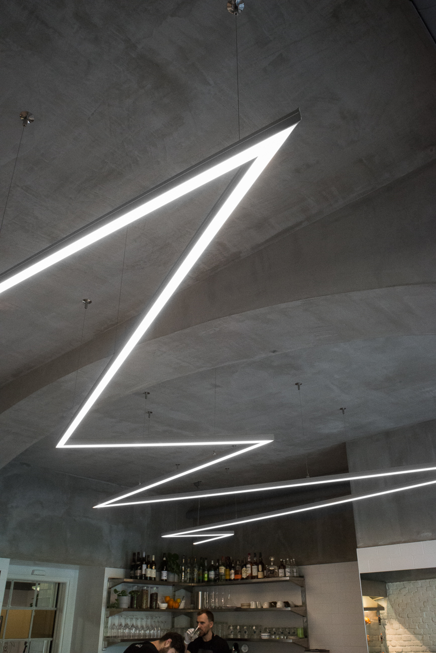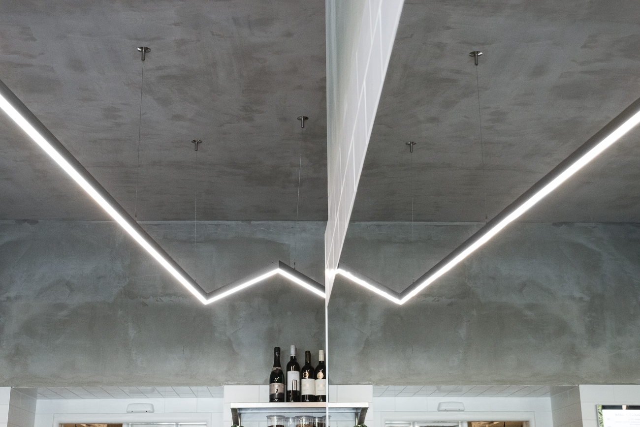 Dieses Bistro wird mittels eines Profils in Blitzform beleuchtet, wobei das LED-ALU-Deckenprofil KLUS 3035 verwendet wurde. Zu seinen Vorteilen gehören die Möglichkeit des Auf- und Abhängens von einer Decke (in horizontaler Richtung) als auch das Aufsetzen auf eine Oberfläche (in horizontaler oder vertikaler Richtung) sowie der Hohlraum für eine verdeckte Führung der Versorgungskabel und Stromleitungen.