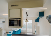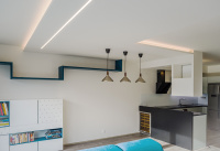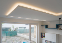In einem Eigenheimneubau wurde eine abgehängte Gipskartondecke angefügt, wobei für die Beleuchtung ein LED-Streifen in einer LED-Leiste KLUŚ MICRO-PLUS verwendet wurde, zu deren Vorzügen die Möglichkeit des Biegens gehört. Auf diese Weise wurde eine angenehme indirekte Beleuchtung des gesamten Wohnbereichs geschaffen. In die Zwischendecke wurde eine Lichtlinie durch Kombination der ALU-Profile TEKNIK + LOKOM eingefügt.