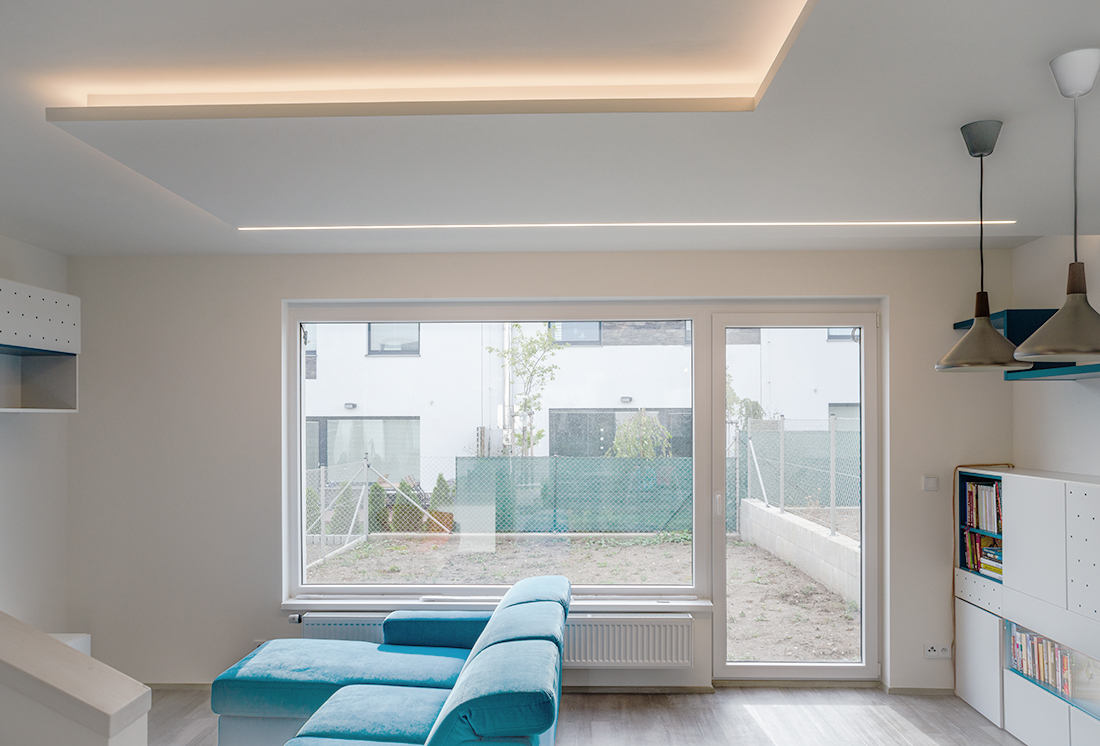 In einem Eigenheimneubau wurde eine abgehängte Gipskartondecke angefügt, wobei für die Beleuchtung ein LED-Streifen in einer LED-Leiste KLUŚ MICRO-PLUS verwendet wurde, zu deren Vorzügen die Möglichkeit des Biegens gehört. Auf diese Weise wurde eine angenehme indirekte Beleuchtung des gesamten Wohnbereichs geschaffen. In die Zwischendecke wurde eine Lichtlinie durch Kombination der ALU-Profile TEKNIK + LOKOM eingefügt.
