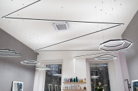 Dieses Friseurgeschäft beleuchten moderne Pendellampen, für deren Fertigung die LED-Leisten KLUŚ PDS-ZM-PLUS (für eine direkte Beleuchtung – unteres Licht) und KLUŚ MICRO-PLUS (für eine indirekte Beleuchtung – oberes Licht) verwendet wurden, die aufeinandergesetzt wurden. Die Lichtlinien in der abgehängten Trockenbaudecke und den Wänden wurde mithilfe der LED-Unterputzleiste KLUŚ PDS-T gefertigt. Ergebnis ist ein Lichtdesign, das nicht nur die praktischen Anforderungen an den Betrieb eines Friseursalons erfüllt, sondern gleichzeitig den modernen Premium-Charakter des Interieurs unterstreicht.