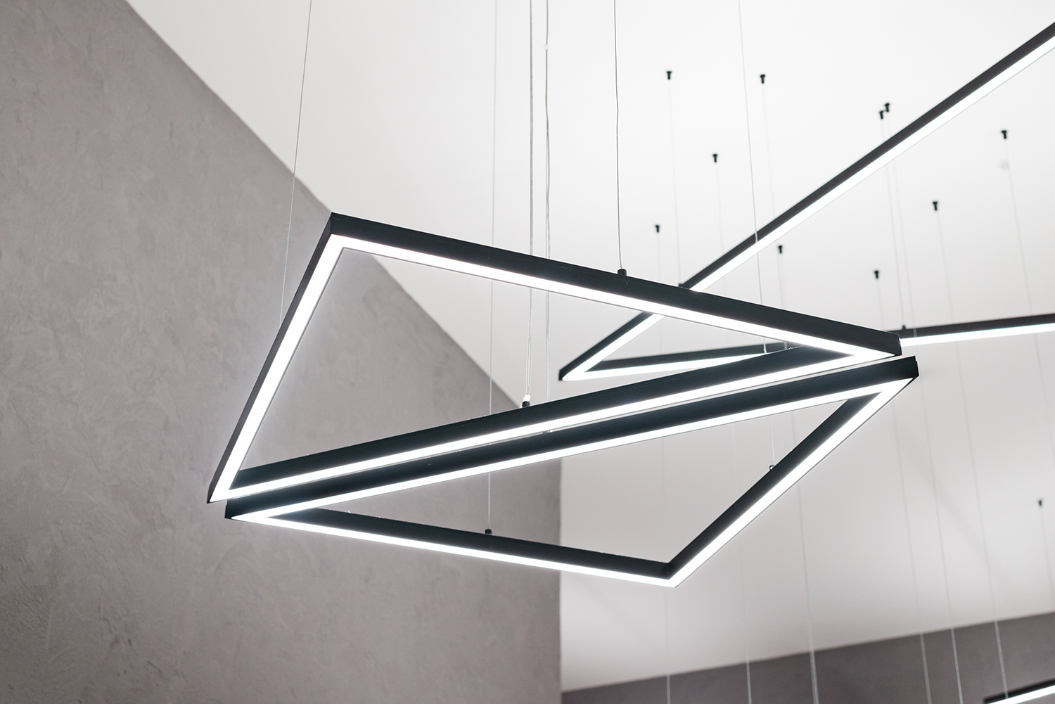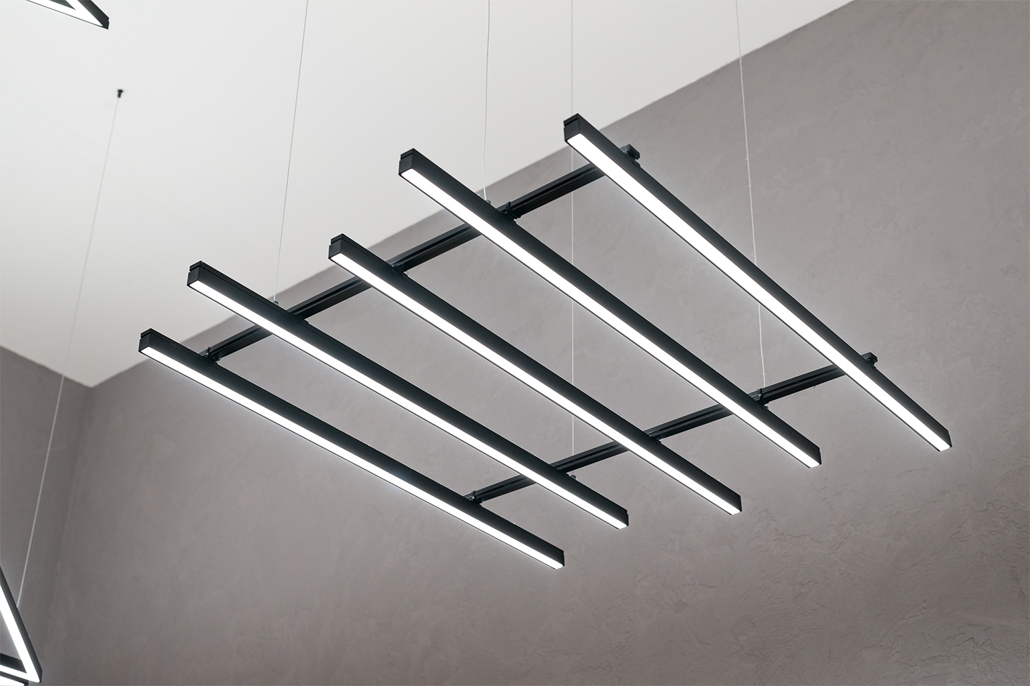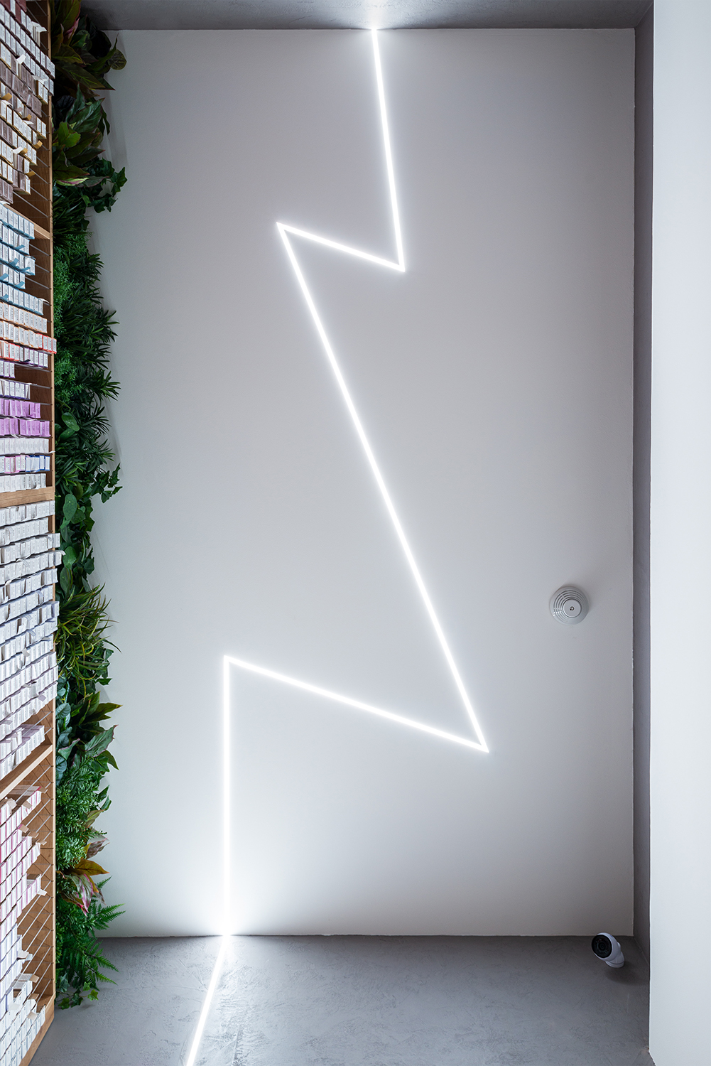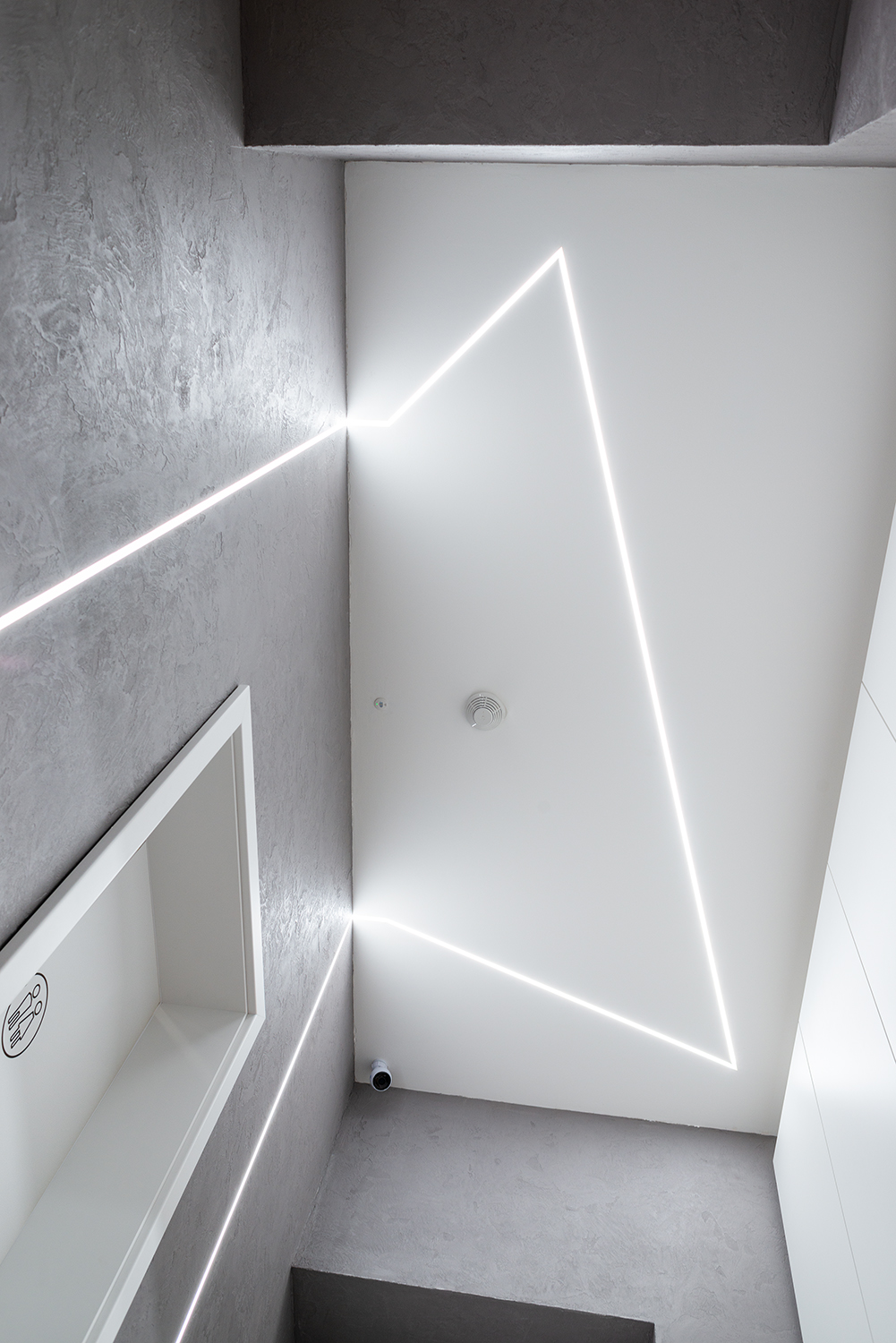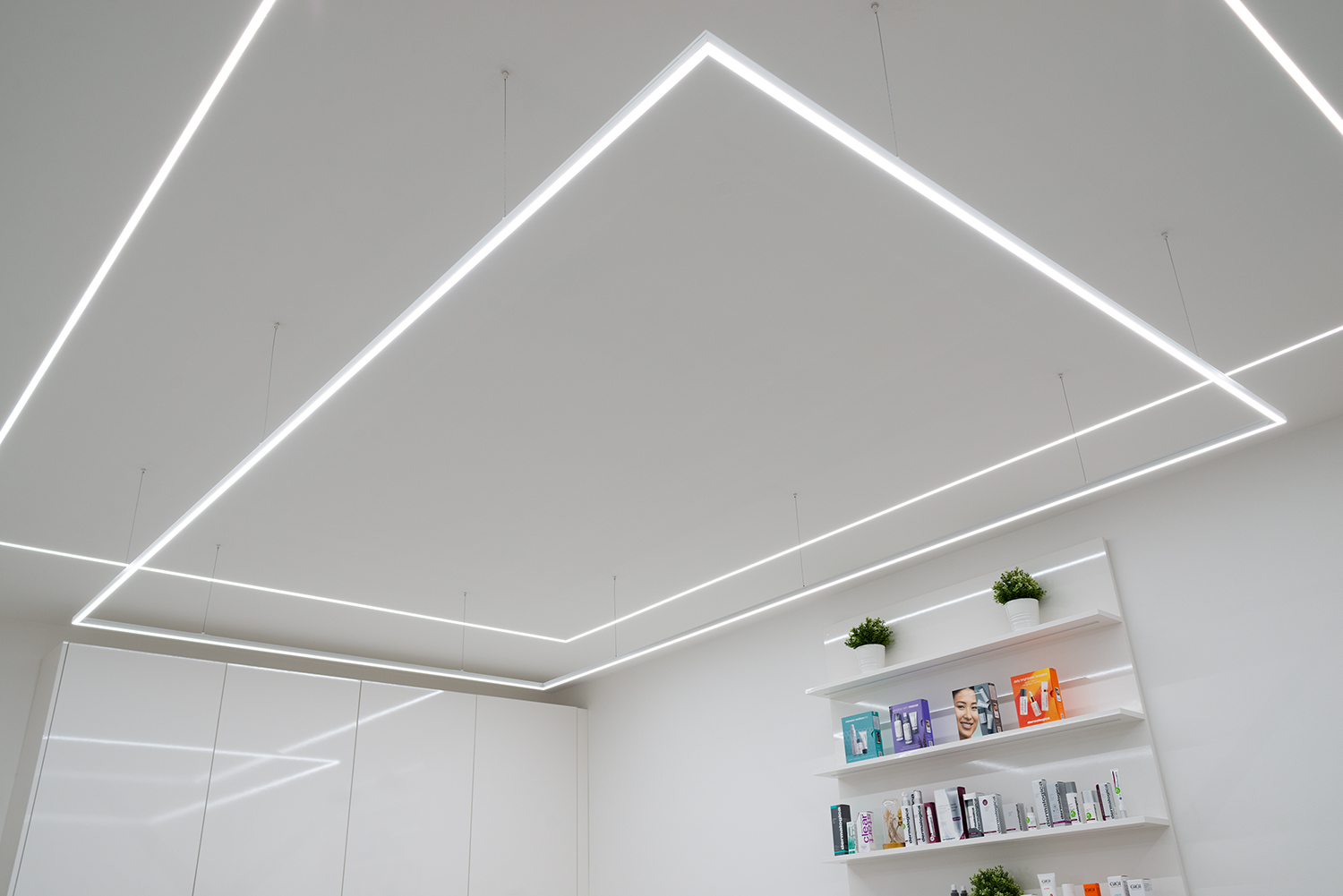 Dieses Friseurgeschäft beleuchten moderne Pendellampen, für deren Fertigung die LED-Leisten KLUŚ PDS-ZM-PLUS (für eine direkte Beleuchtung – unteres Licht) und KLUŚ MICRO-PLUS (für eine indirekte Beleuchtung – oberes Licht) verwendet wurden, die aufeinandergesetzt wurden. Die Lichtlinien in der abgehängten Trockenbaudecke und den Wänden wurde mithilfe der LED-Unterputzleiste KLUŚ PDS-T gefertigt. Ergebnis ist ein Lichtdesign, das nicht nur die praktischen Anforderungen an den Betrieb eines Friseursalons erfüllt, sondern gleichzeitig den modernen Premium-Charakter des Interieurs unterstreicht.