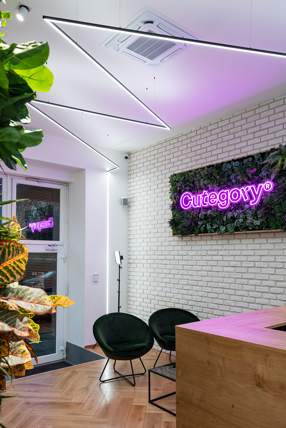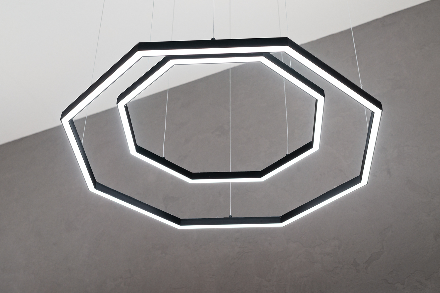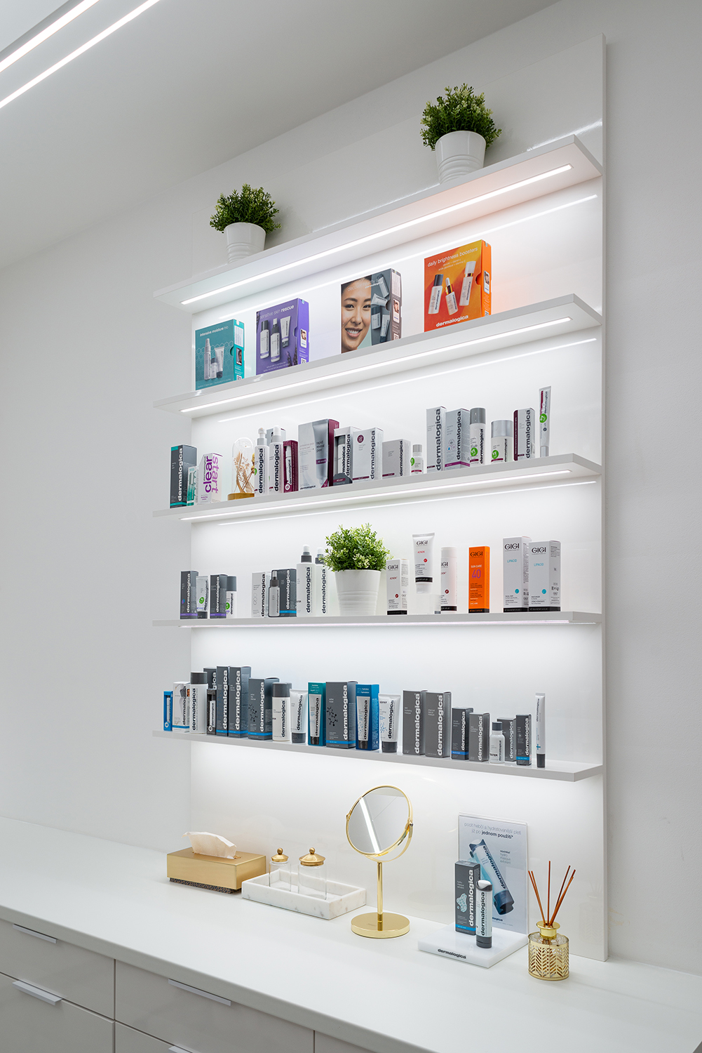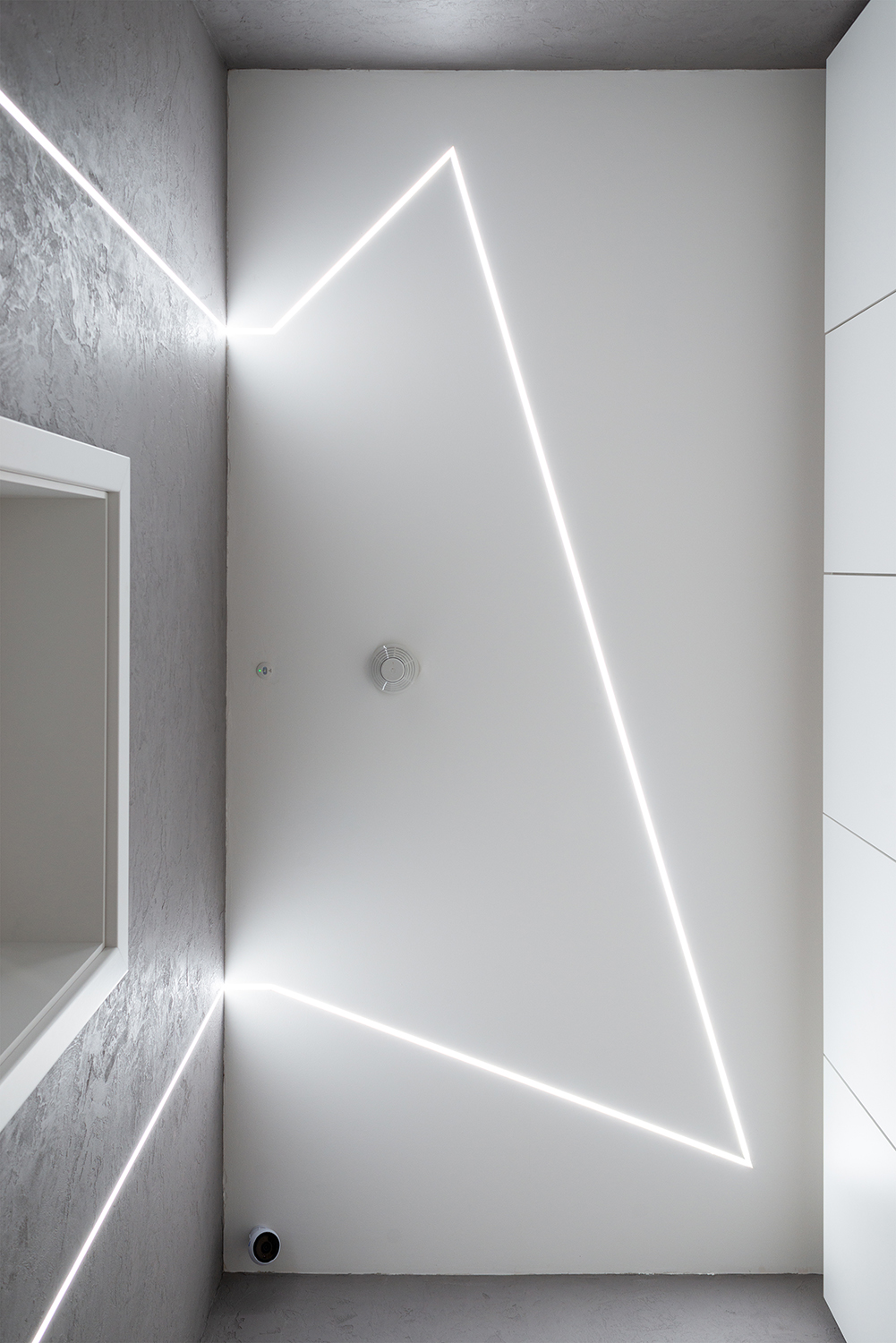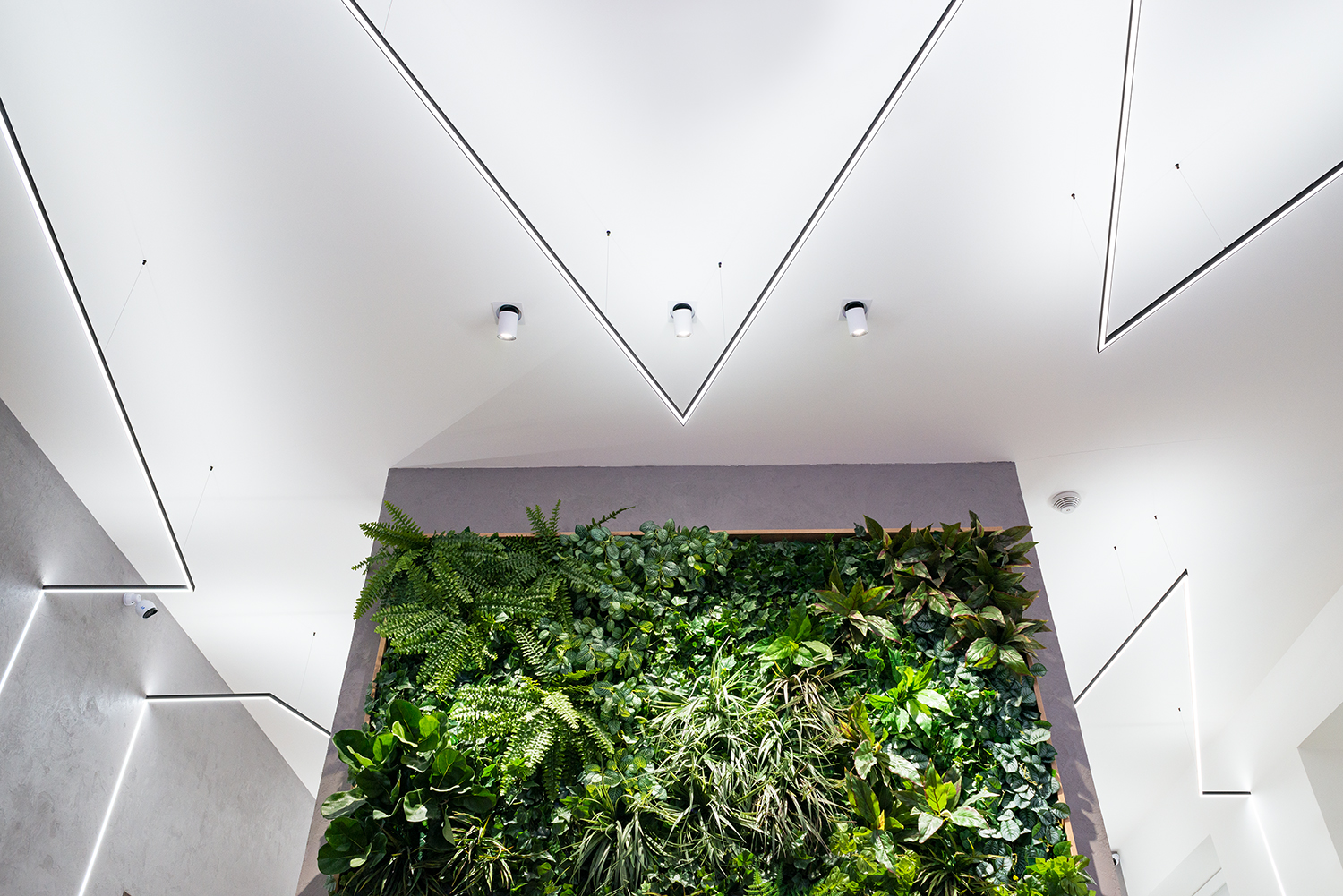 Dieses Friseurgeschäft beleuchten moderne Pendellampen, für deren Fertigung die LED-Leisten KLUŚ PDS-ZM-PLUS (für eine direkte Beleuchtung – unteres Licht) und KLUŚ MICRO-PLUS (für eine indirekte Beleuchtung – oberes Licht) verwendet wurden, die aufeinandergesetzt wurden. Die Lichtlinien in der abgehängten Trockenbaudecke und den Wänden wurde mithilfe der LED-Unterputzleiste KLUŚ PDS-T gefertigt. Ergebnis ist ein Lichtdesign, das nicht nur die praktischen Anforderungen an den Betrieb eines Friseursalons erfüllt, sondern gleichzeitig den modernen Premium-Charakter des Interieurs unterstreicht.