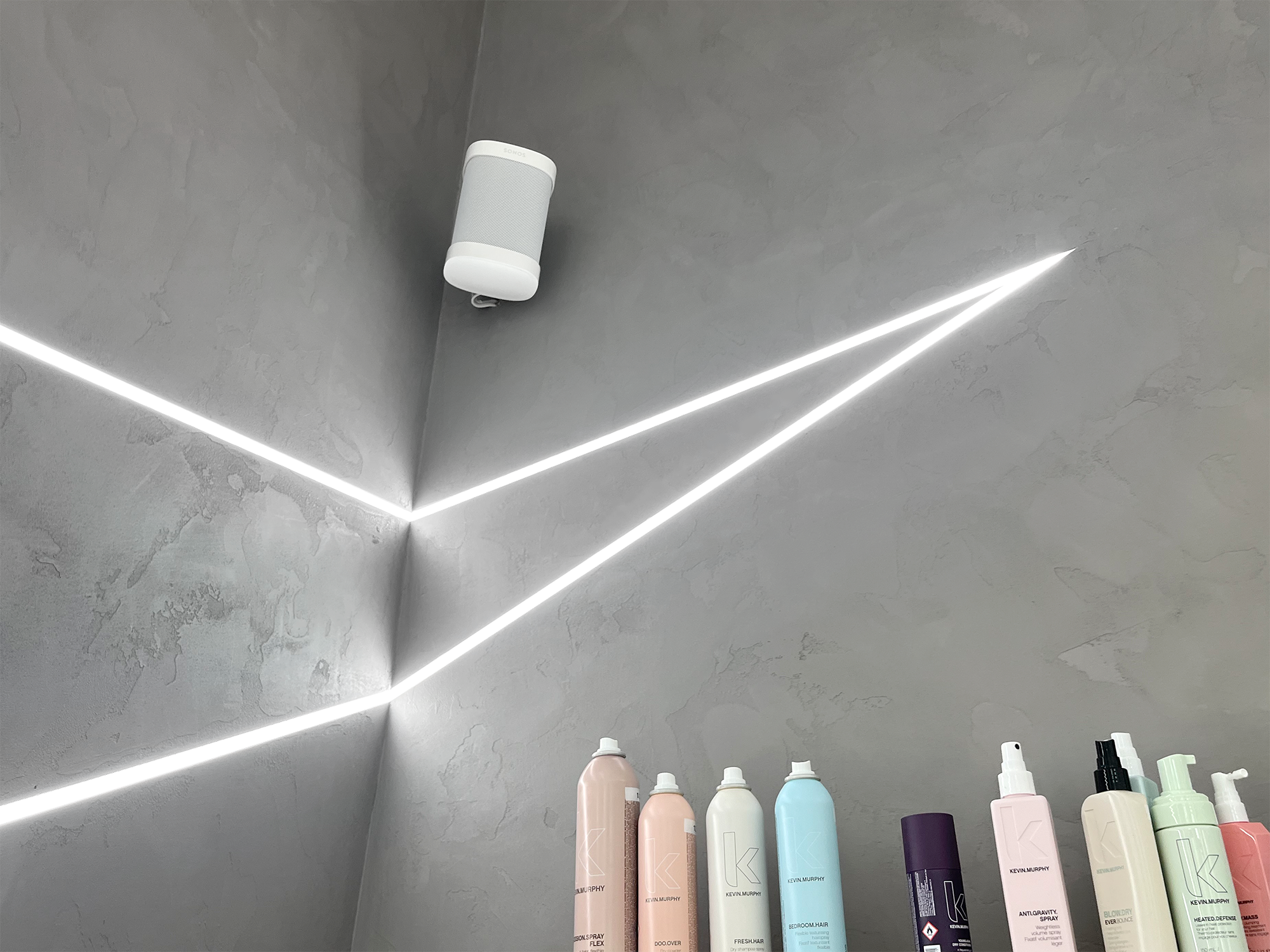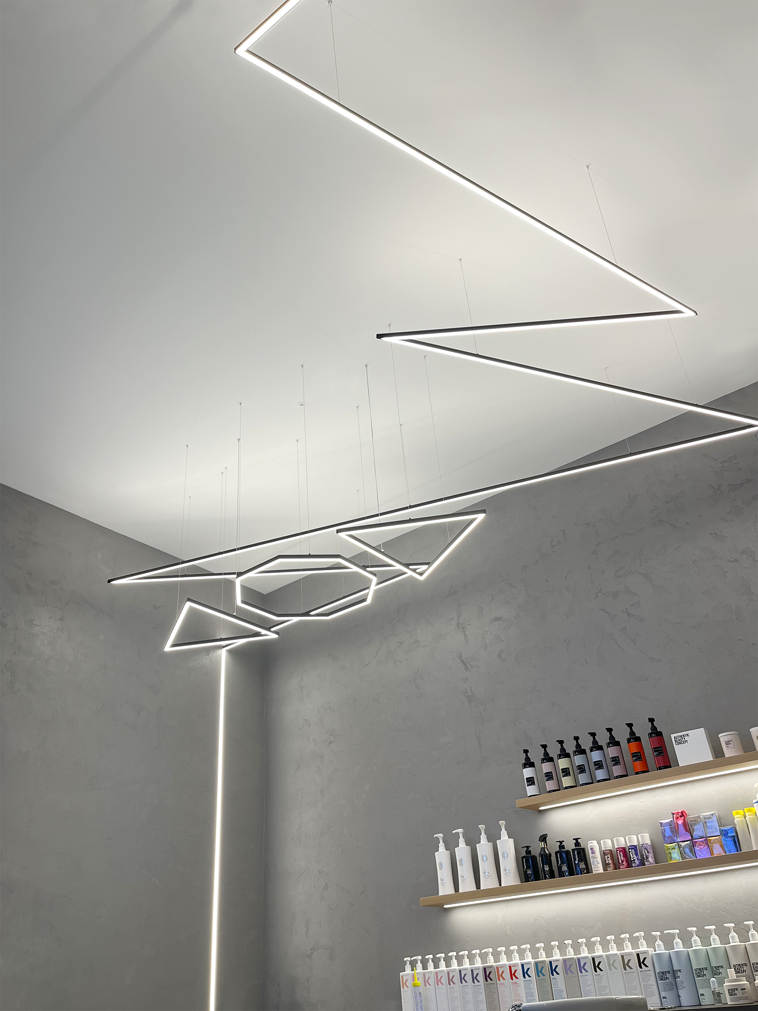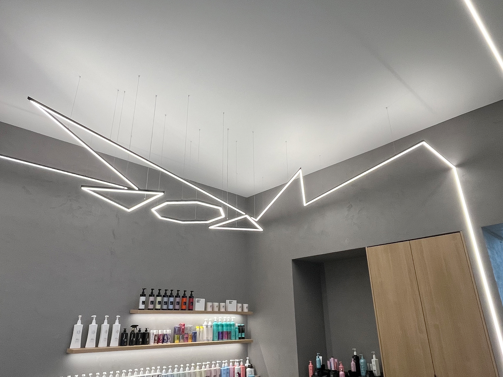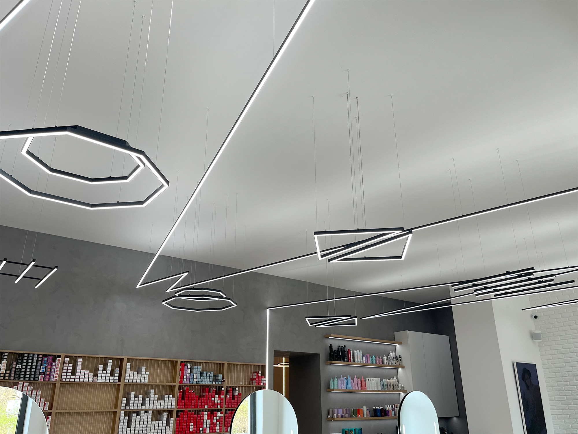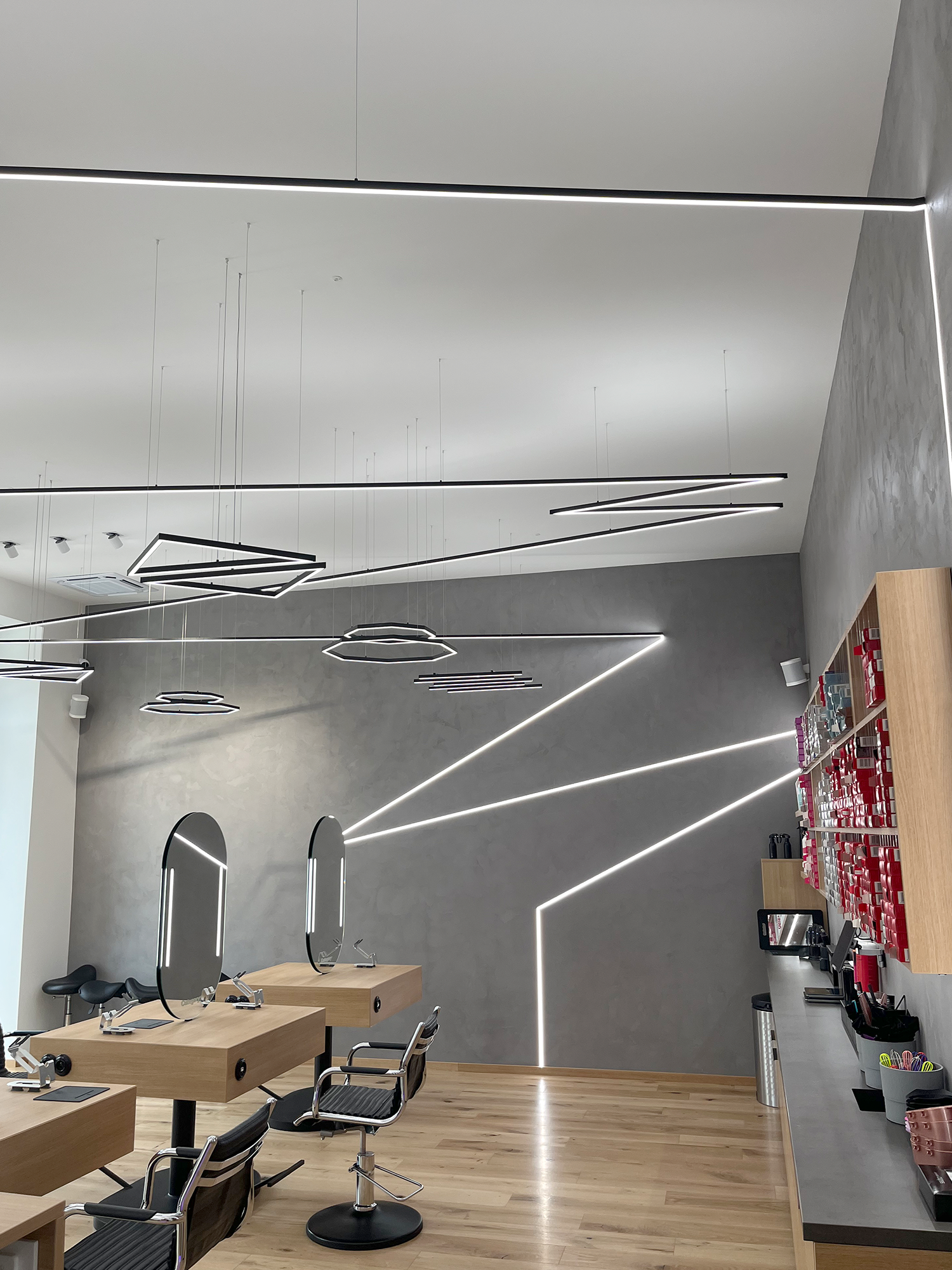 In diesem Friseursalon wurde eine Beleuchtung geschaffen, die den professionellen Ansatz und die freundliche Atmosphäre unterstreicht, in der sich die Kunden wohl fühlen. Und gleichzeitig auch eine Beleuchtung, die optimale Lichtbedingungen für die präzise Arbeit der Friseure sicherstellt. Die dominanten Pendelleuchten wurden mithilfe der LED-Leisten KLUŚ PDS-ZM-PLUS (für eine direkte Beleuchtung – unteres Licht) und KLUŚ MICRO-PLUS (für eine indirekte Beleuchtung – oberes Licht) gefertigt. Die Lichtlinien in der abgehängten Trockenbaudecke und den Wänden wurden mithilfe der LED-Unterputzleiste KLUŚ PDS-T gefertigt.