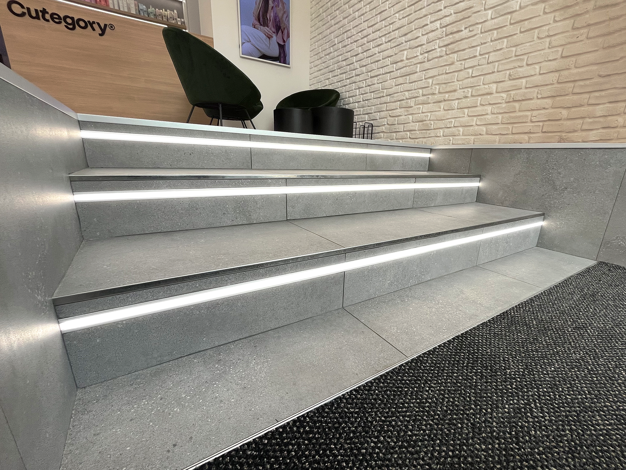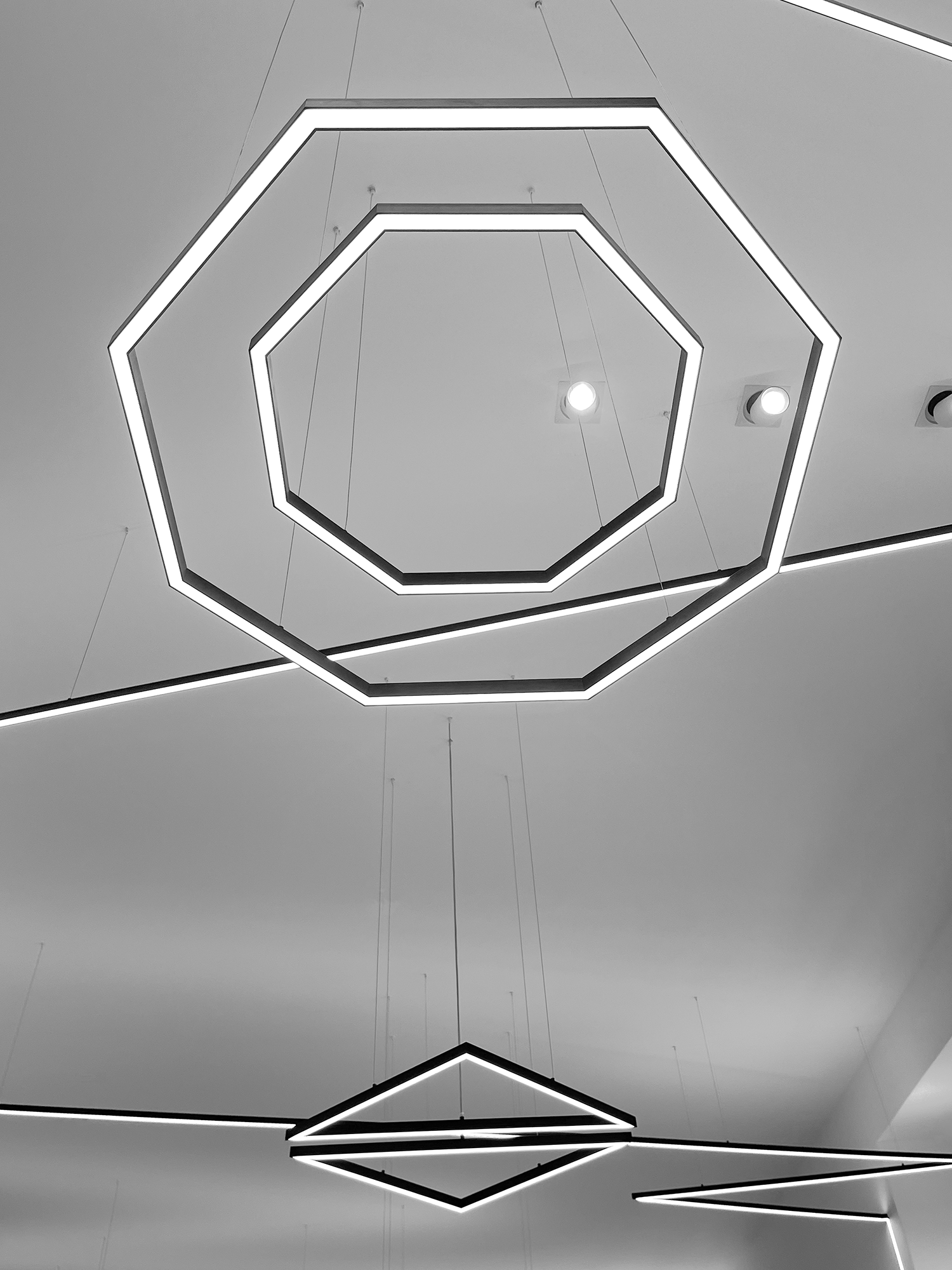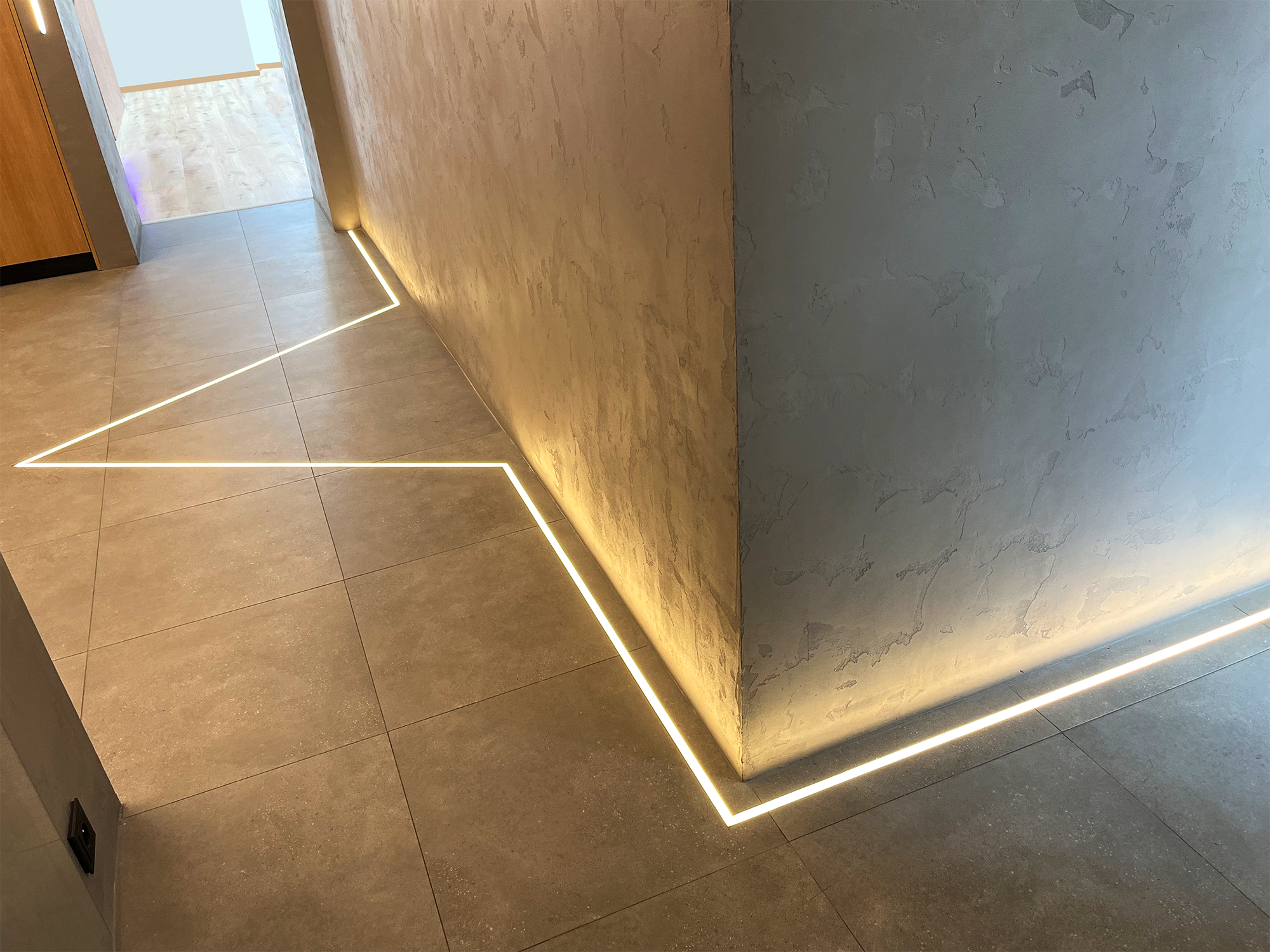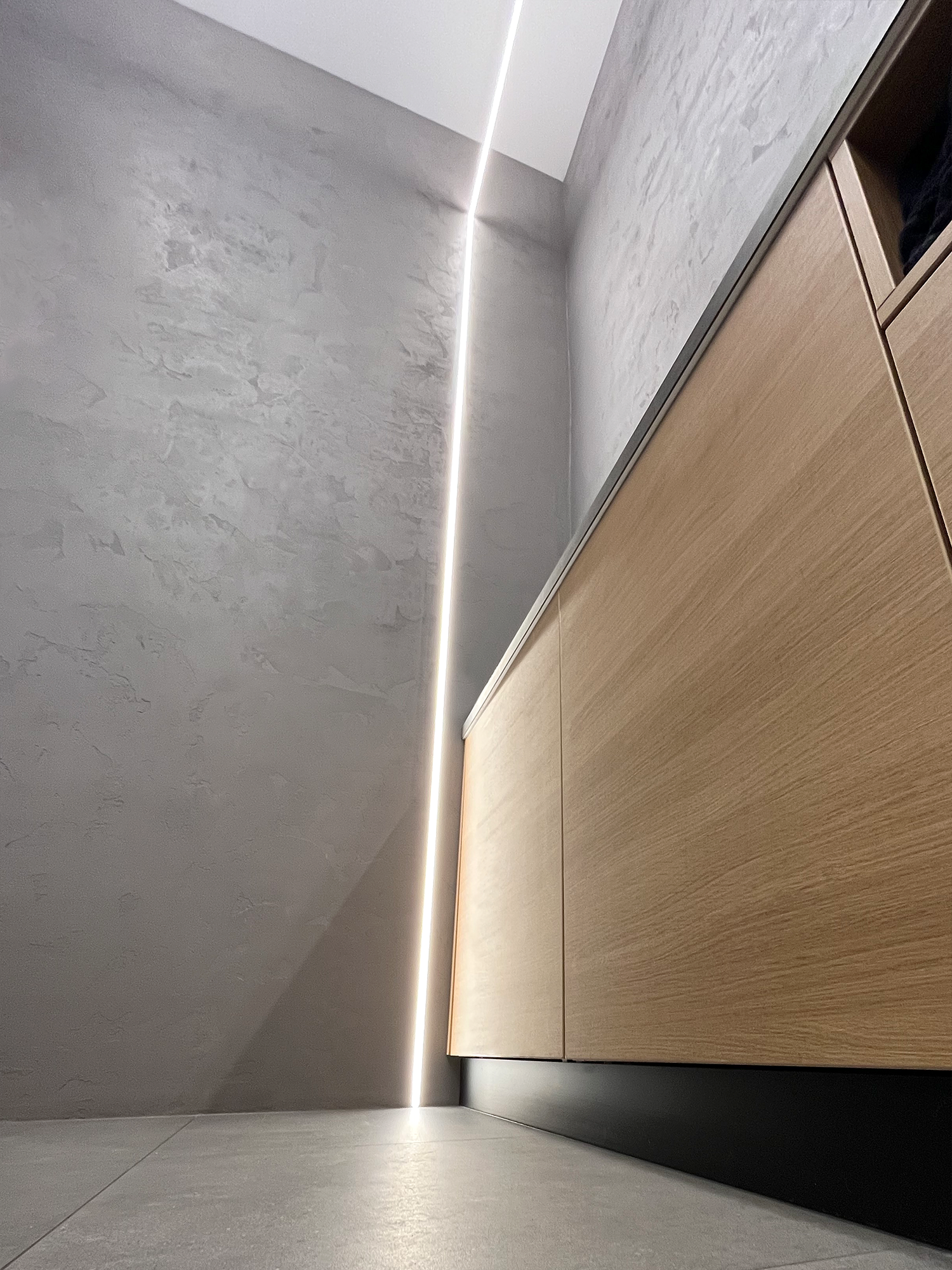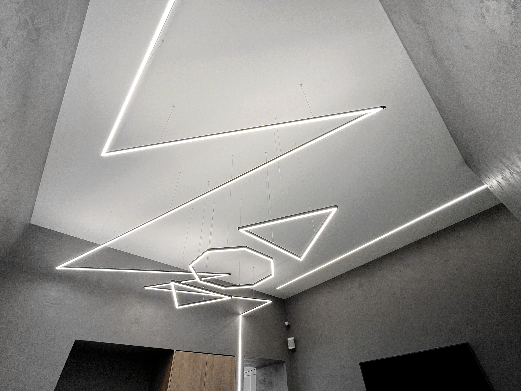 In diesem Friseursalon wurde eine Beleuchtung geschaffen, die den professionellen Ansatz und die freundliche Atmosphäre unterstreicht, in der sich die Kunden wohl fühlen. Und gleichzeitig auch eine Beleuchtung, die optimale Lichtbedingungen für die präzise Arbeit der Friseure sicherstellt. Die dominanten Pendelleuchten wurden mithilfe der LED-Leisten KLUŚ PDS-ZM-PLUS (für eine direkte Beleuchtung – unteres Licht) und KLUŚ MICRO-PLUS (für eine indirekte Beleuchtung – oberes Licht) gefertigt. Die Lichtlinien in der abgehängten Trockenbaudecke und den Wänden wurden mithilfe der LED-Unterputzleiste KLUŚ PDS-T gefertigt.