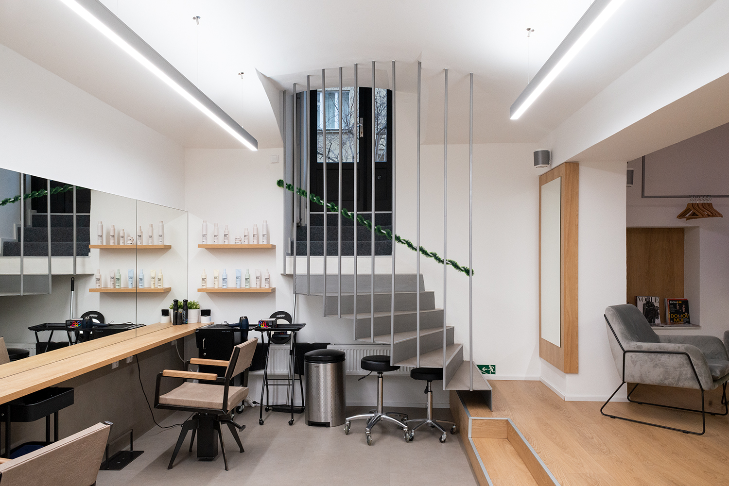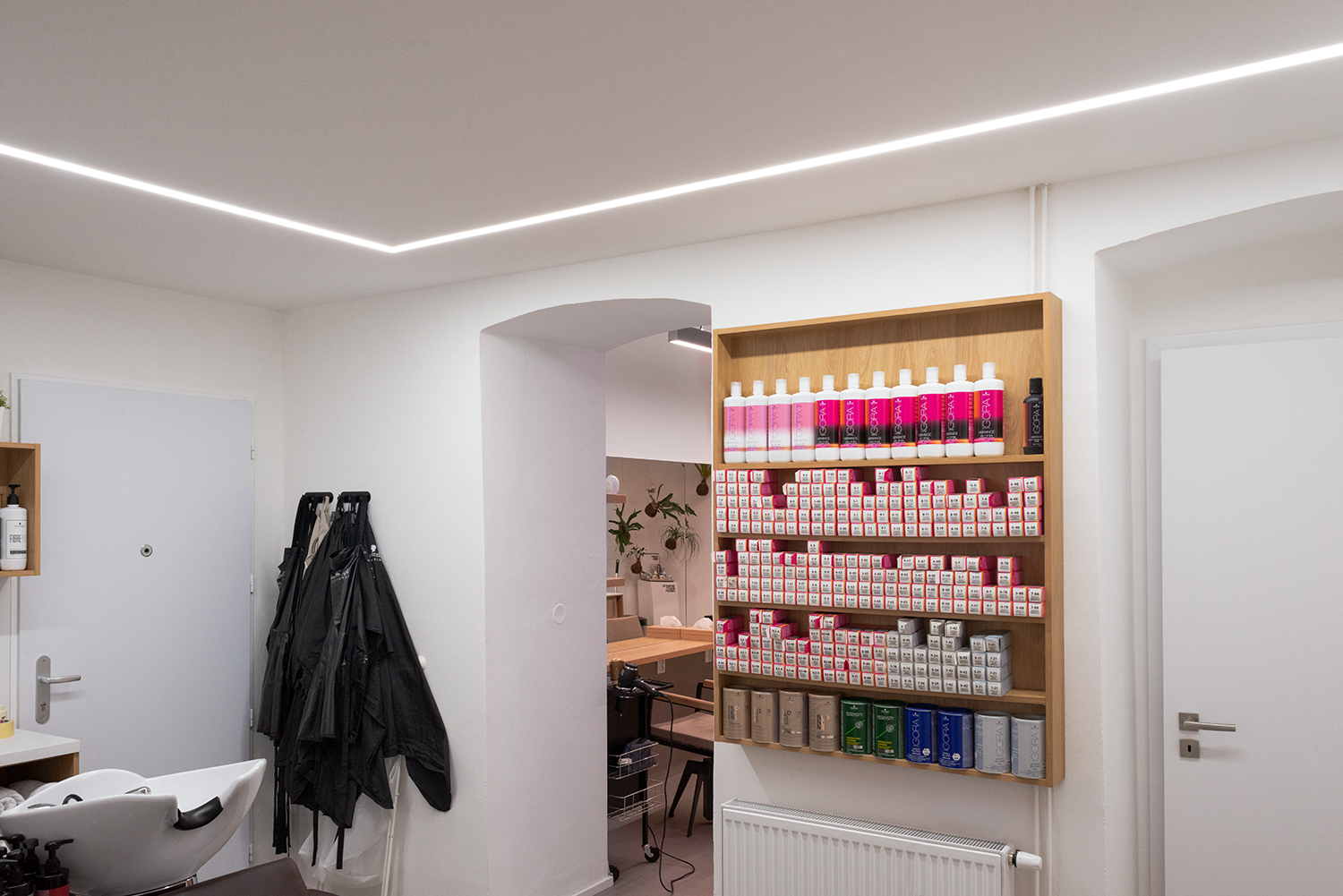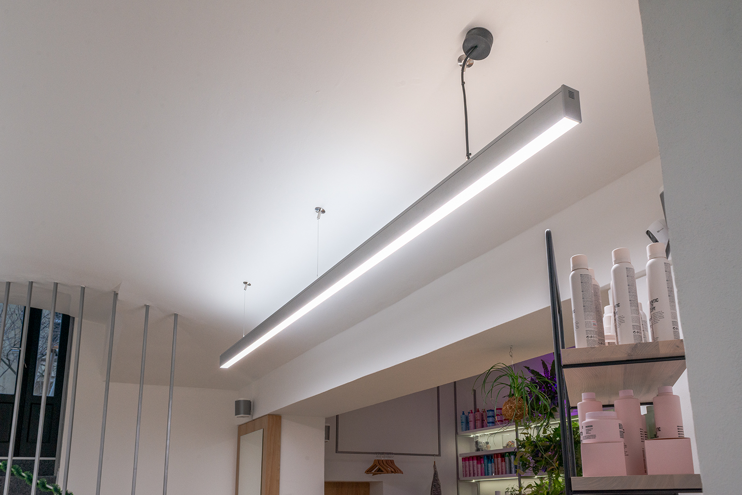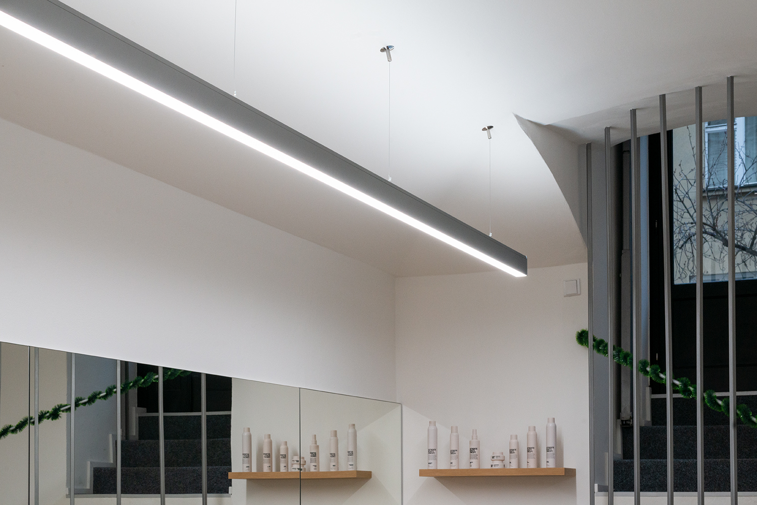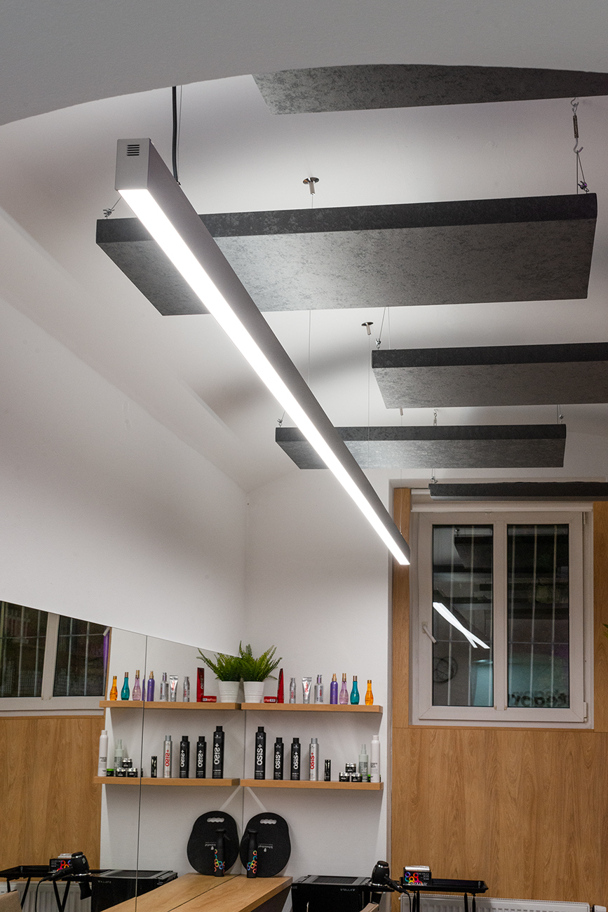 Dieser Friseurladen wird durch einen Satz Pendelleuchten mit direkter (unteres Licht) wie auch indirekter Beleuchtung (oberes Licht) geschaffen, wobei die LED-Profile KLUŚ DES verwendet wurden. In der abgehängten Trockenbaudecke wurde das LED-Einlassprofil KLUŚ KOZEL-50 installiert. Auf diese Weise wurde eine optimale Beleuchtung für die präzise Arbeit der Friseure sichergestellt.