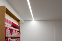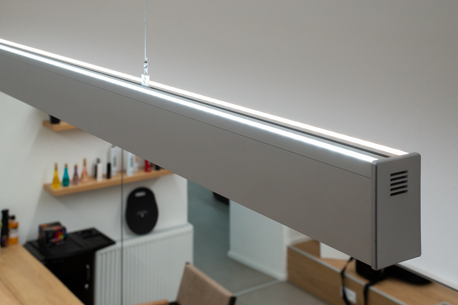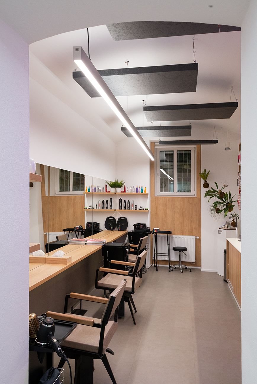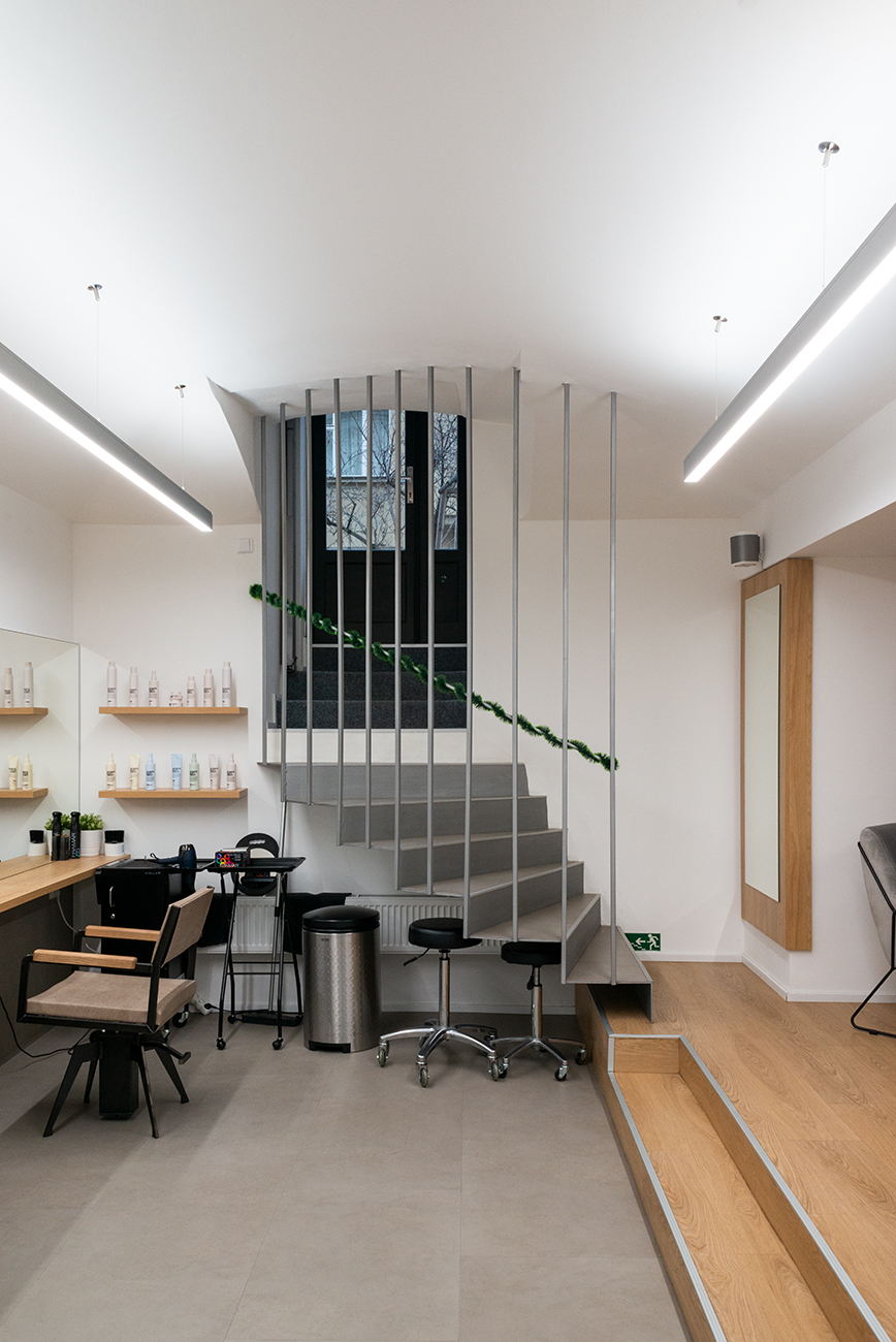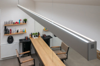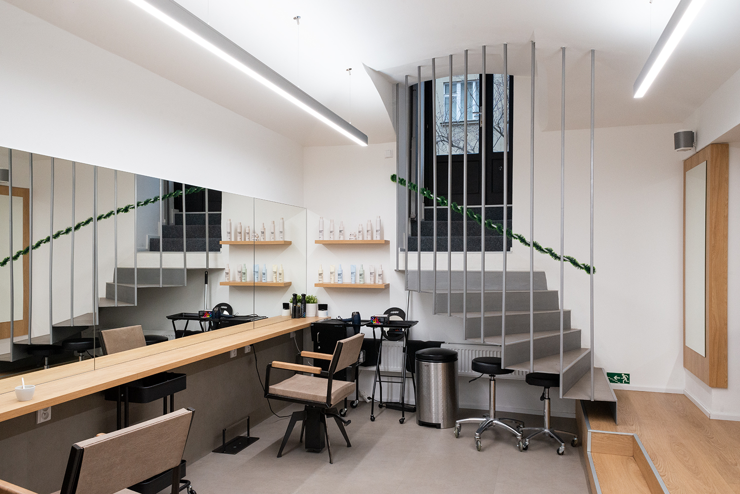 Dieser Friseurladen wird durch einen Satz Pendelleuchten mit direkter (unteres Licht) wie auch indirekter Beleuchtung (oberes Licht) geschaffen, wobei die LED-Profile KLUŚ DES verwendet wurden. In der abgehängten Trockenbaudecke wurde das LED-Einlassprofil KLUŚ KOZEL-50 installiert. Auf diese Weise wurde eine optimale Beleuchtung für die präzise Arbeit der Friseure sichergestellt.