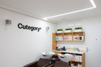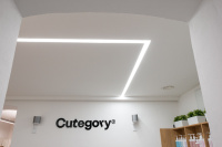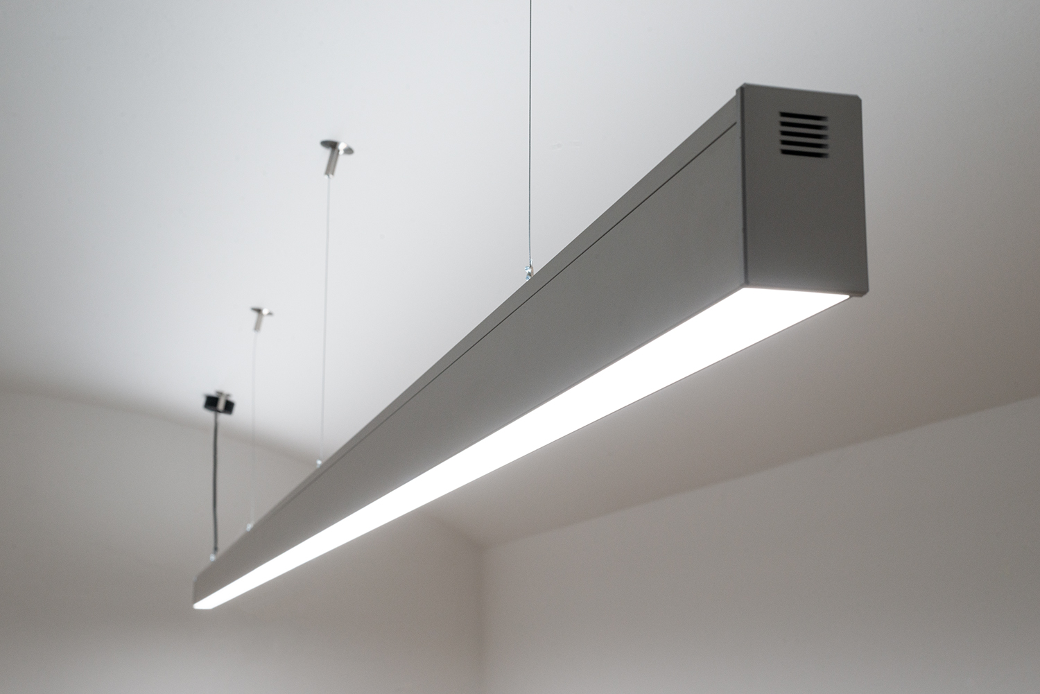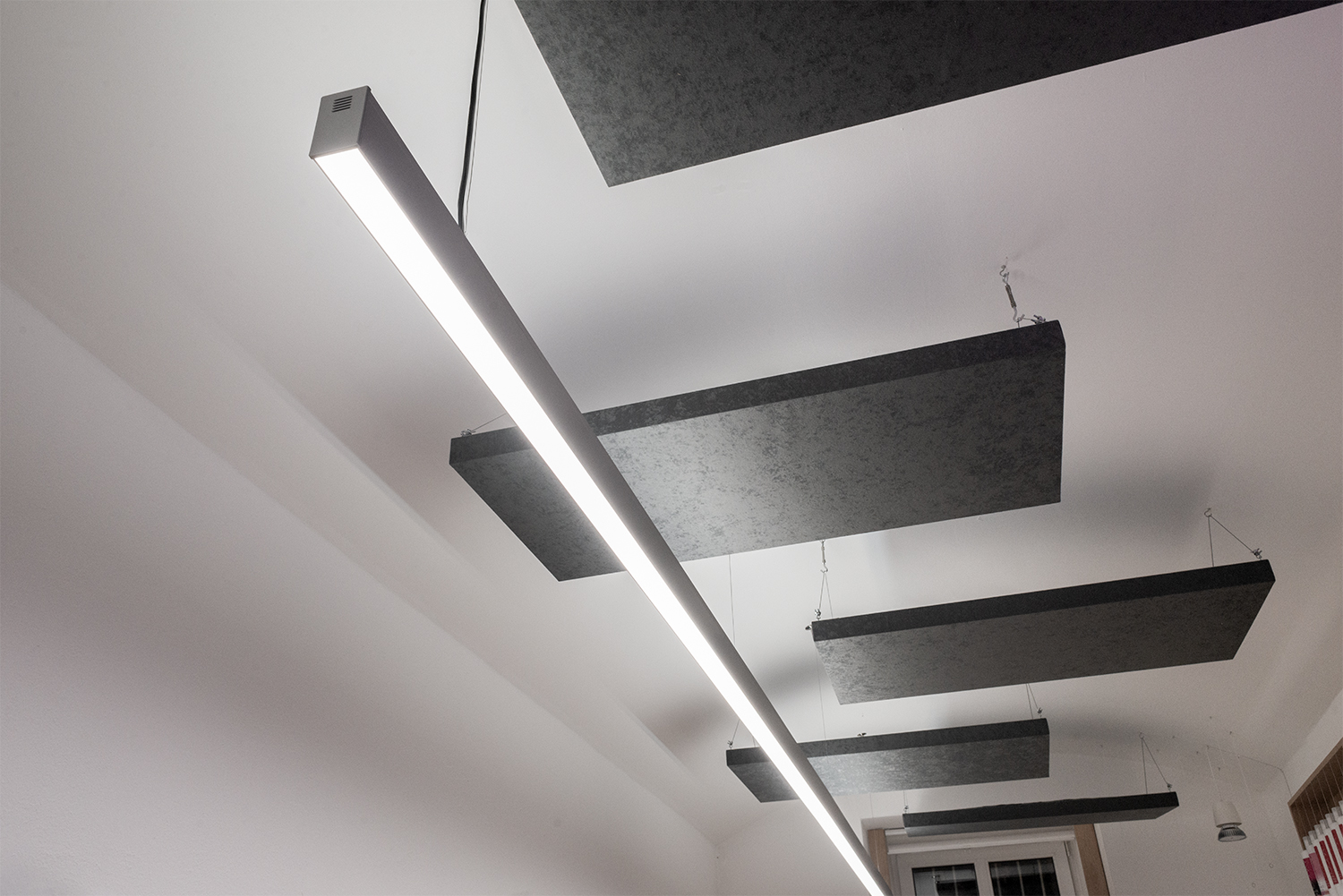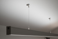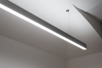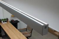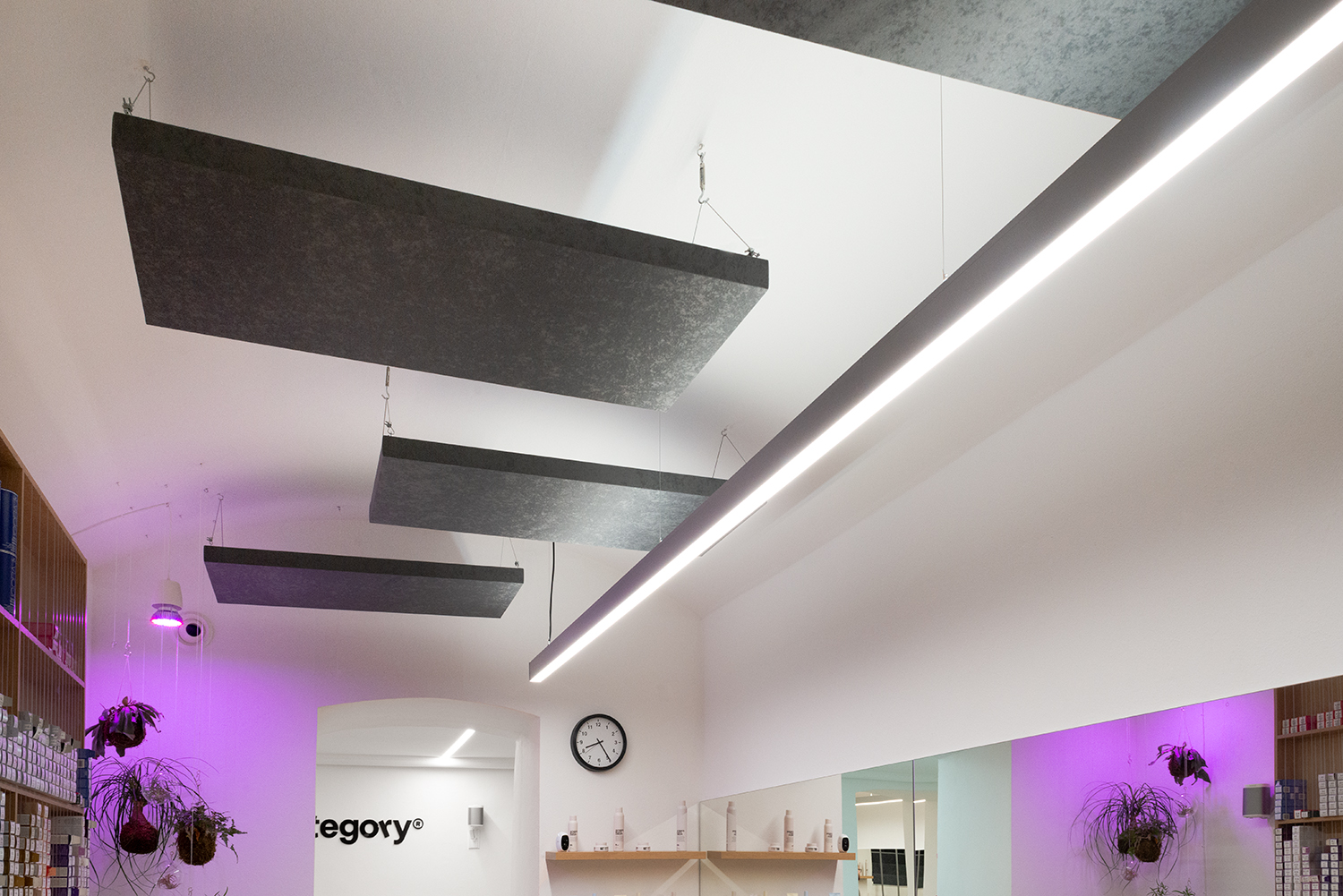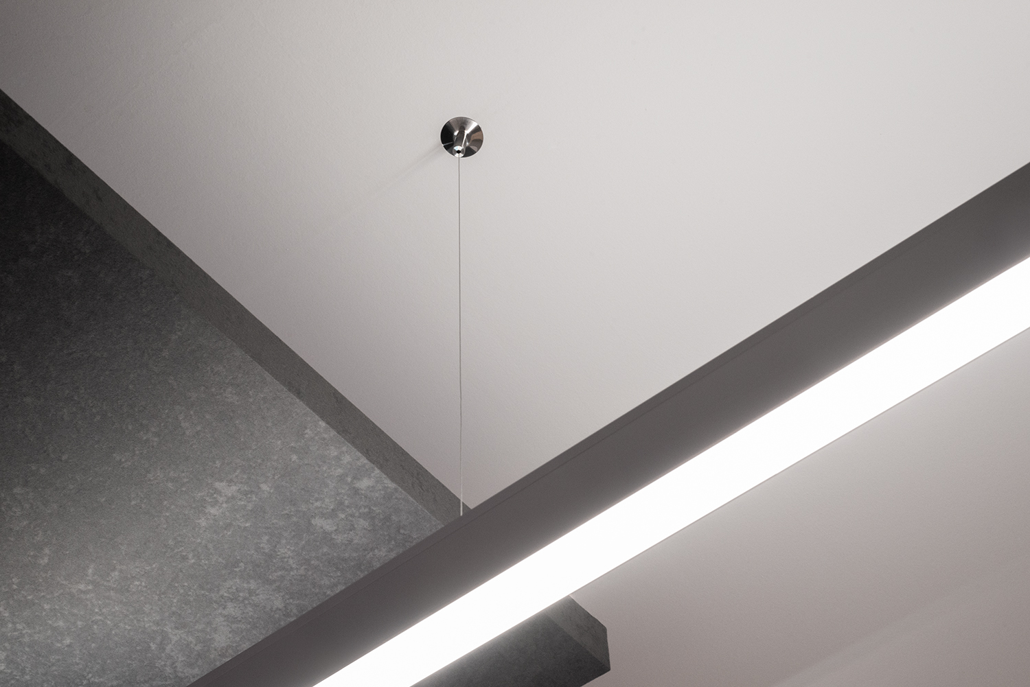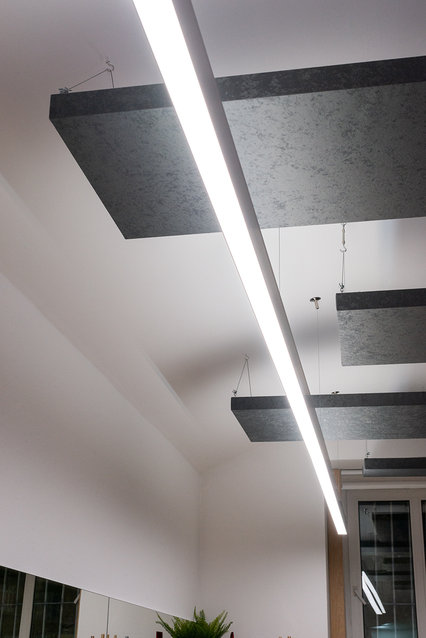Dieser Friseurladen wird durch einen Satz Pendelleuchten mit direkter (unteres Licht) wie auch indirekter Beleuchtung (oberes Licht) geschaffen, wobei die LED-Profile KLUŚ DES verwendet wurden. In der abgehängten Trockenbaudecke wurde das LED-Einlassprofil KLUŚ KOZEL-50 installiert. Auf diese Weise wurde eine optimale Beleuchtung für die präzise Arbeit der Friseure sichergestellt.