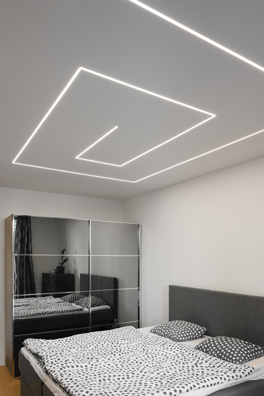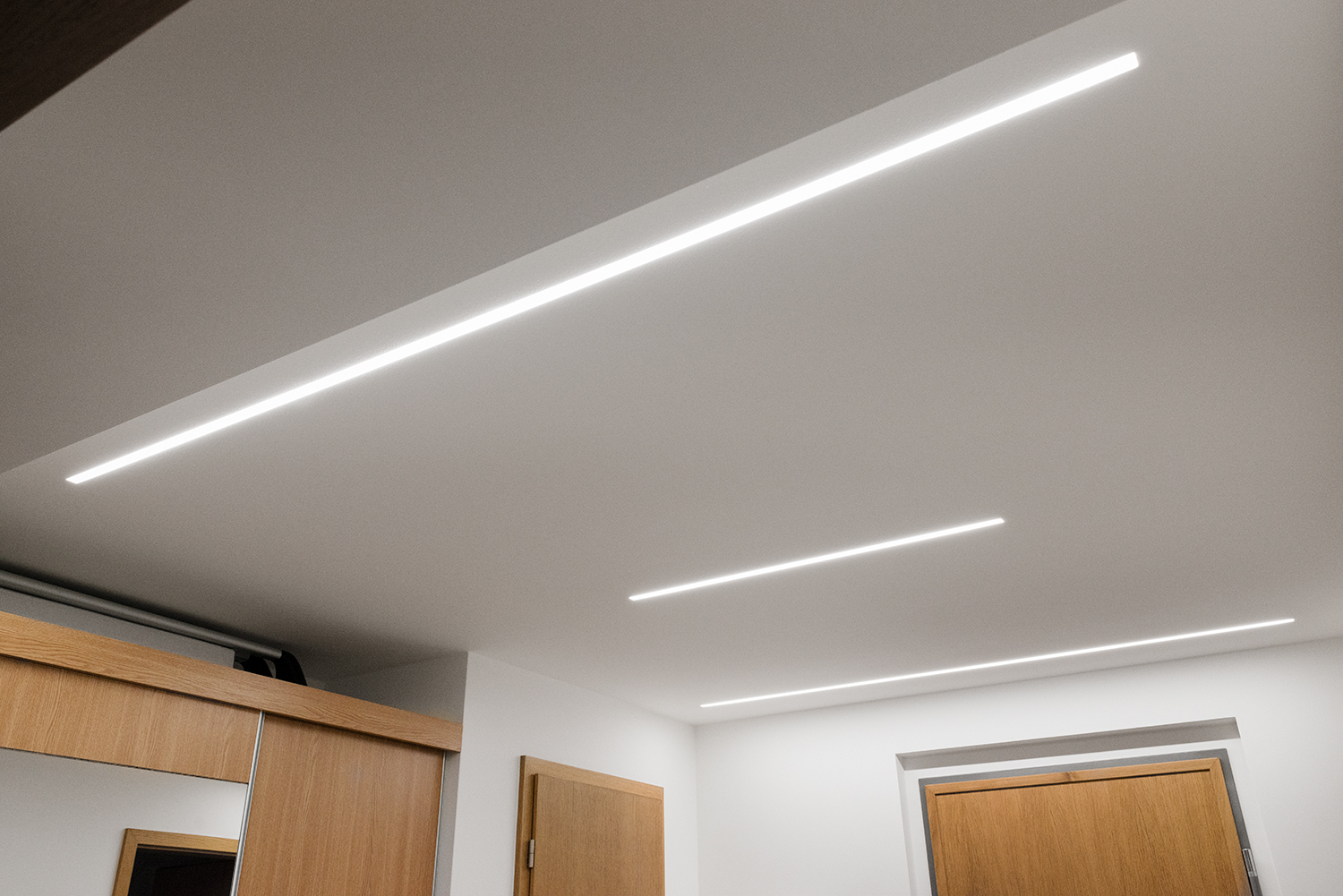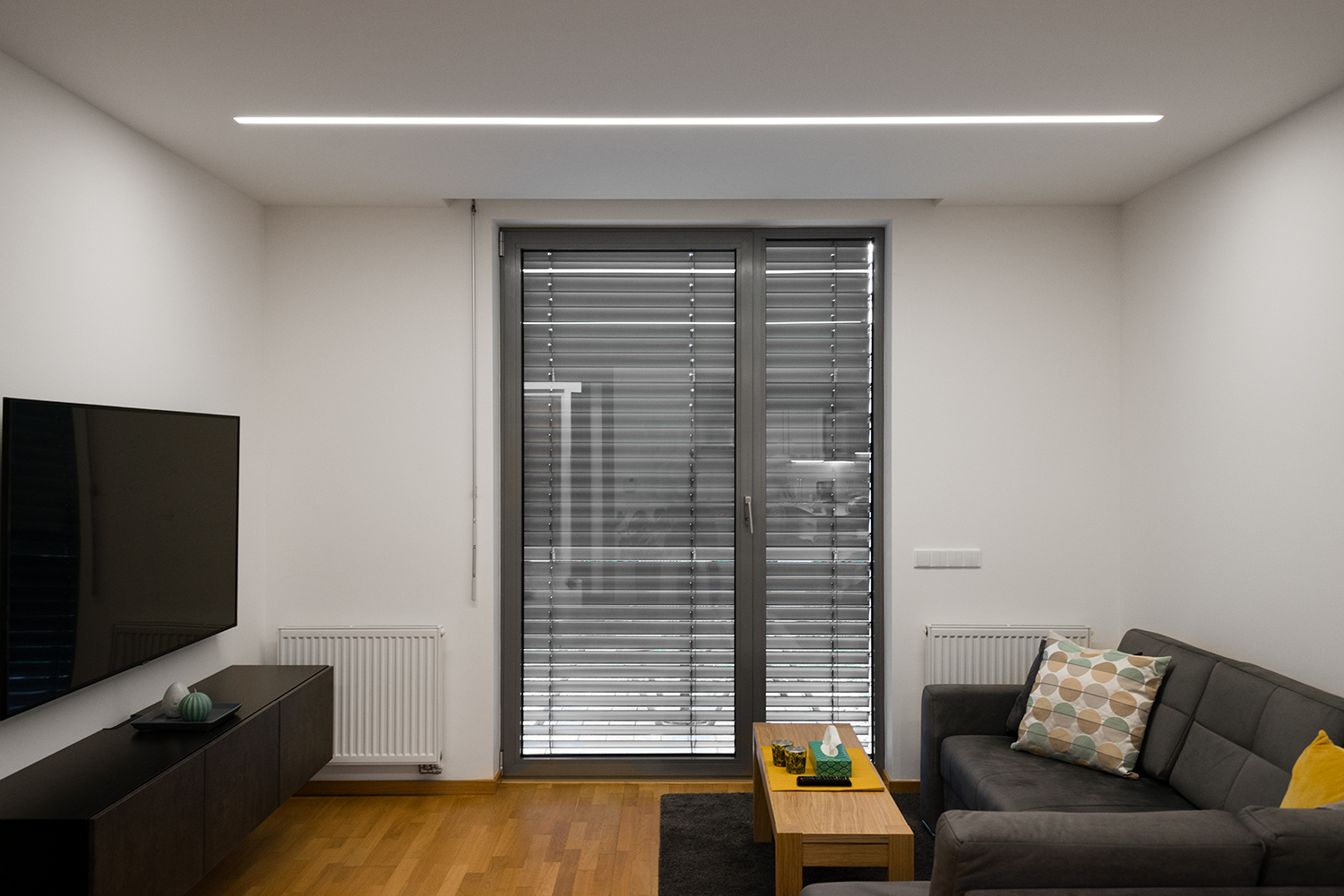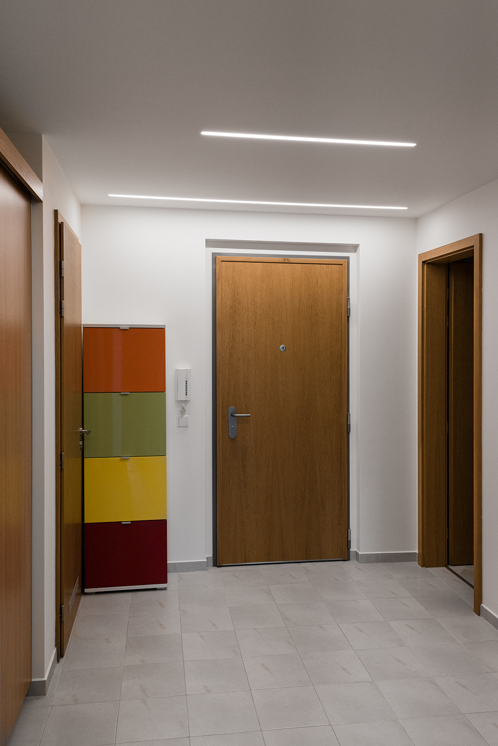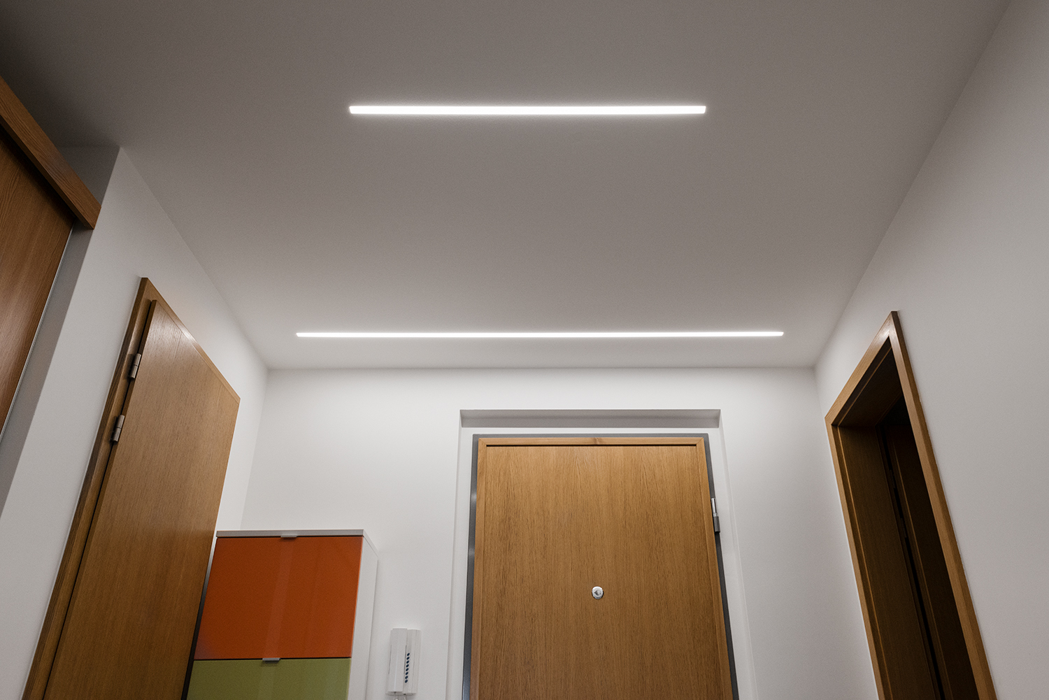 Der Flur wird mit dem LED-Unterputzprofil KLUŚ KOZEL beleuchtet. In weiteren Räumen, wie im Wohn- und im Schlafzimmer, wurden in der abgehängten Trockenbaudecke die dünnere LED-Leiste KLUŚ KOZEL-10 und das breitere LED-Profil KLUŚ KOZEL-50 verwendet. Die LED -Eckleiste mit einem Abstrahlwinkel von 45° KLUŚ 45-16 kam nicht nur für die Beleuchtung der Küchenzeile, der Regale und Schränkchen, sondern dank der möglichen Schutzart bis IP67 auch in der Dusche zum Einsatz.