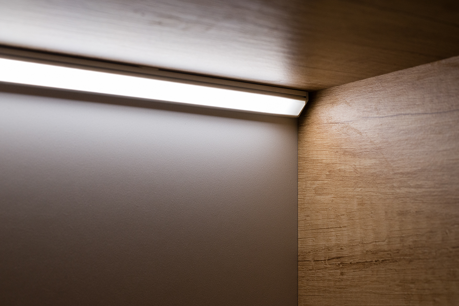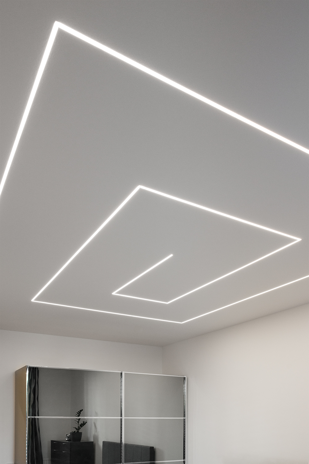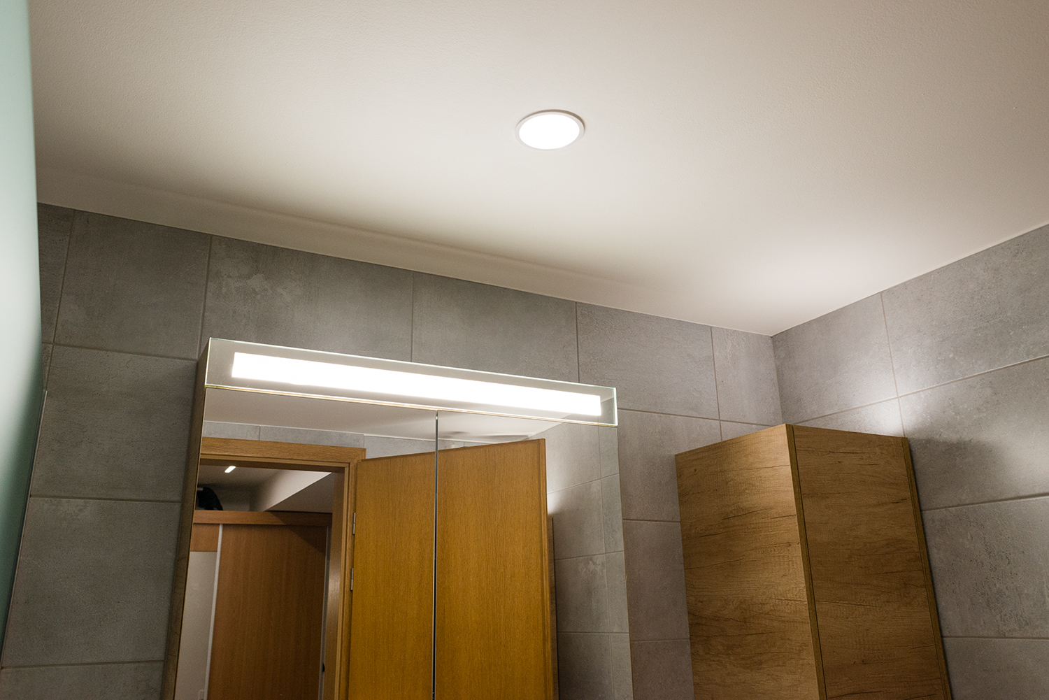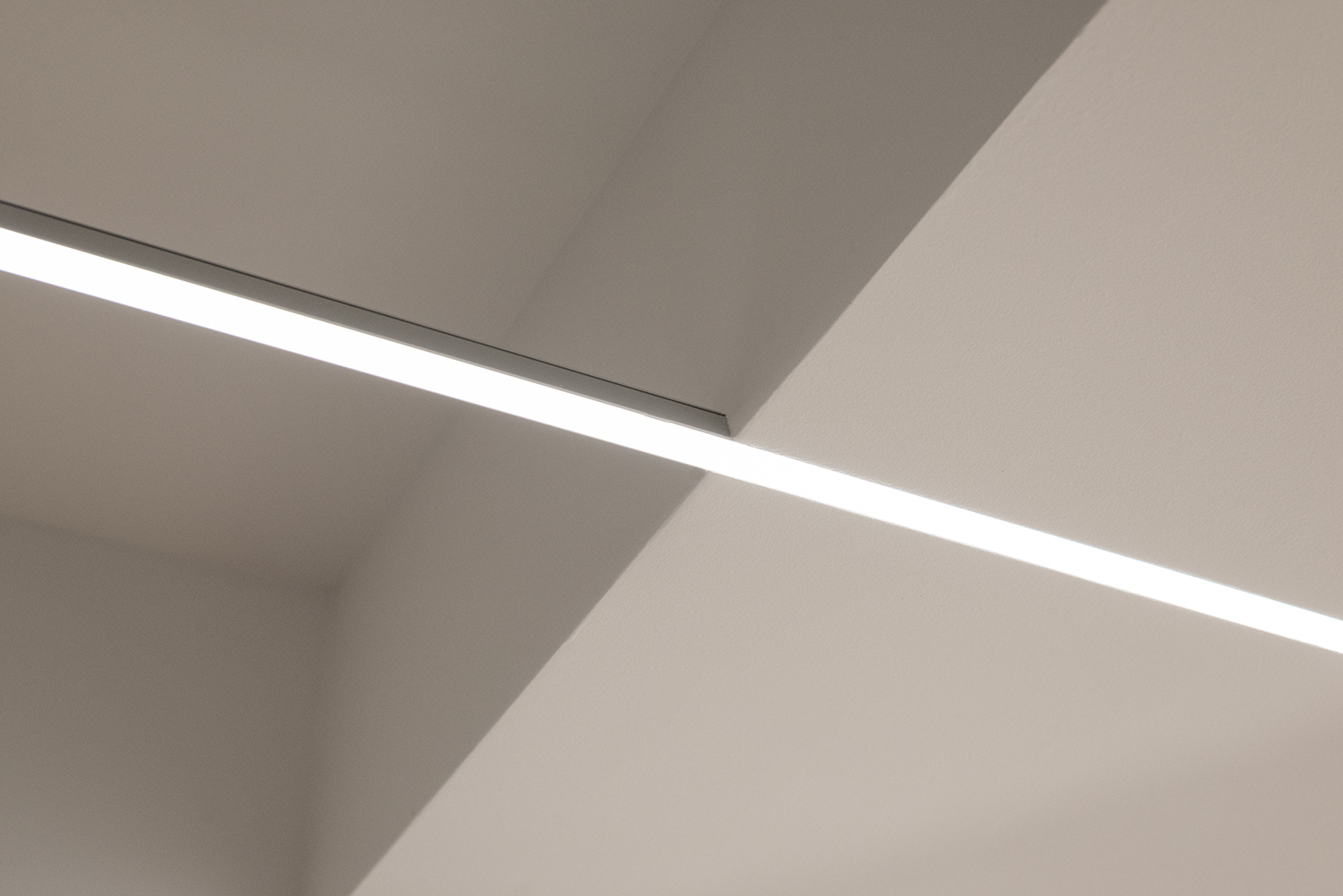 Der Flur wird mit dem LED-Unterputzprofil KLUŚ KOZEL beleuchtet. In weiteren Räumen, wie im Wohn- und im Schlafzimmer, wurden in der abgehängten Trockenbaudecke die dünnere LED-Leiste KLUŚ KOZEL-10 und das breitere LED-Profil KLUŚ KOZEL-50 verwendet. Die LED -Eckleiste mit einem Abstrahlwinkel von 45° KLUŚ 45-16 kam nicht nur für die Beleuchtung der Küchenzeile, der Regale und Schränkchen, sondern dank der möglichen Schutzart bis IP67 auch in der Dusche zum Einsatz.