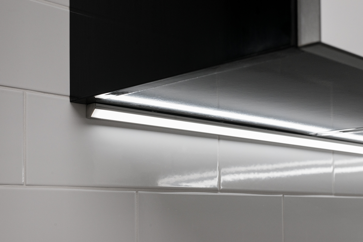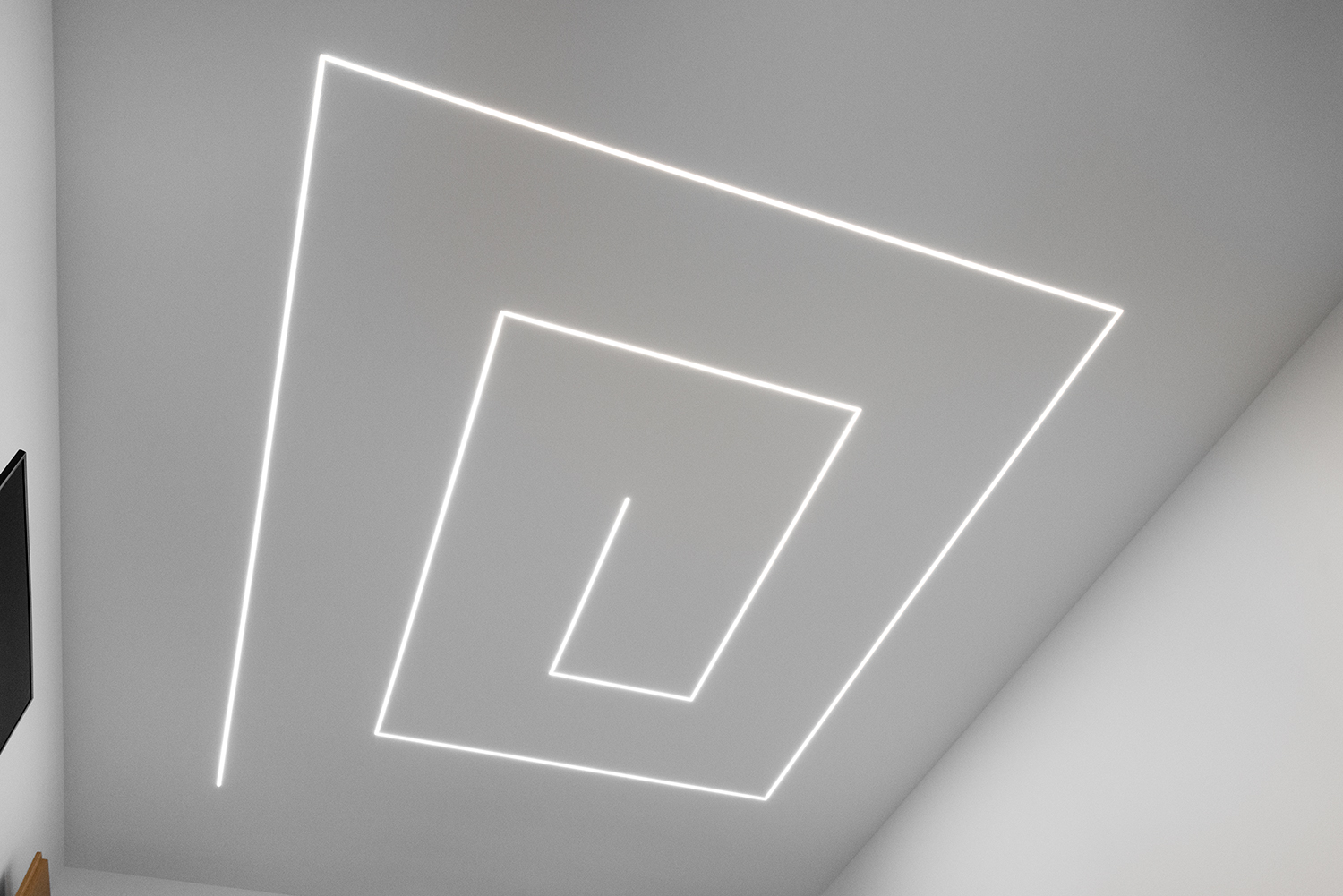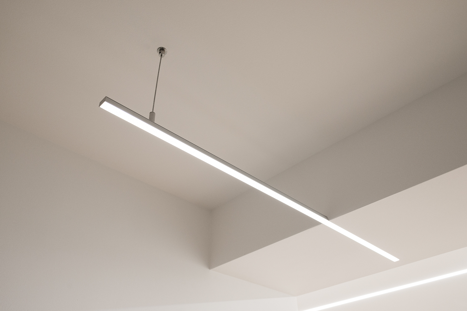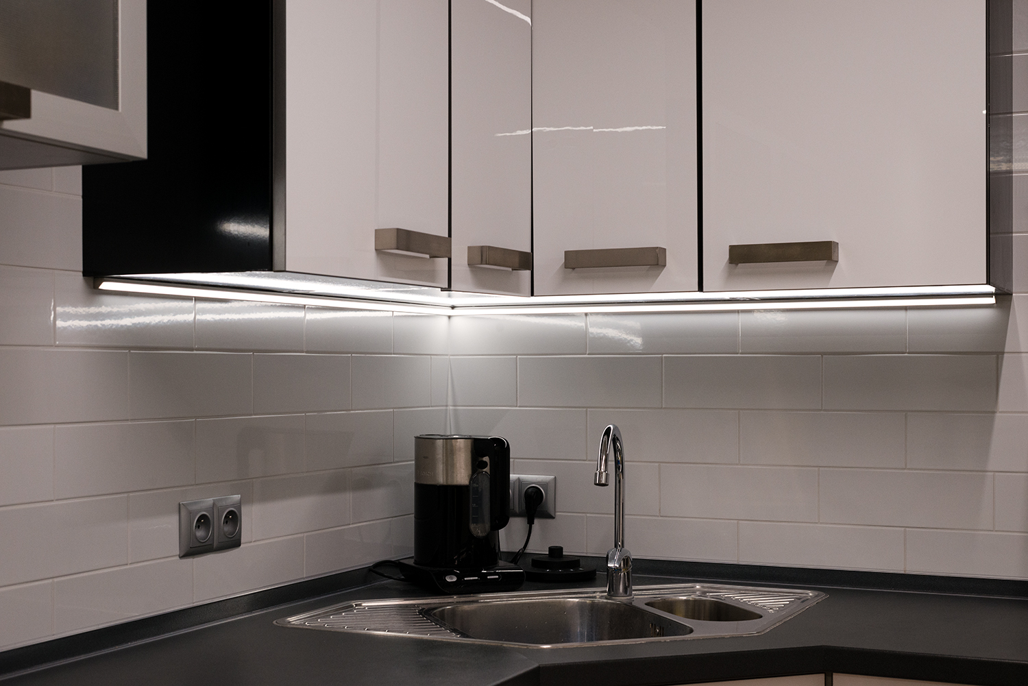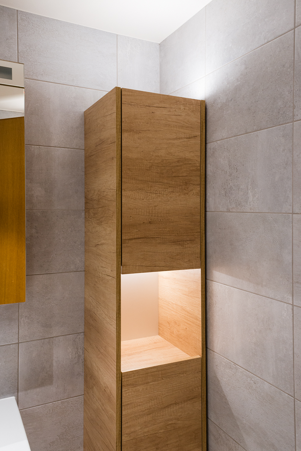 Der Flur wird mit dem LED-Unterputzprofil KLUŚ KOZEL beleuchtet. In weiteren Räumen, wie im Wohn- und im Schlafzimmer, wurden in der abgehängten Trockenbaudecke die dünnere LED-Leiste KLUŚ KOZEL-10 und das breitere LED-Profil KLUŚ KOZEL-50 verwendet. Die LED -Eckleiste mit einem Abstrahlwinkel von 45° KLUŚ 45-16 kam nicht nur für die Beleuchtung der Küchenzeile, der Regale und Schränkchen, sondern dank der möglichen Schutzart bis IP67 auch in der Dusche zum Einsatz.