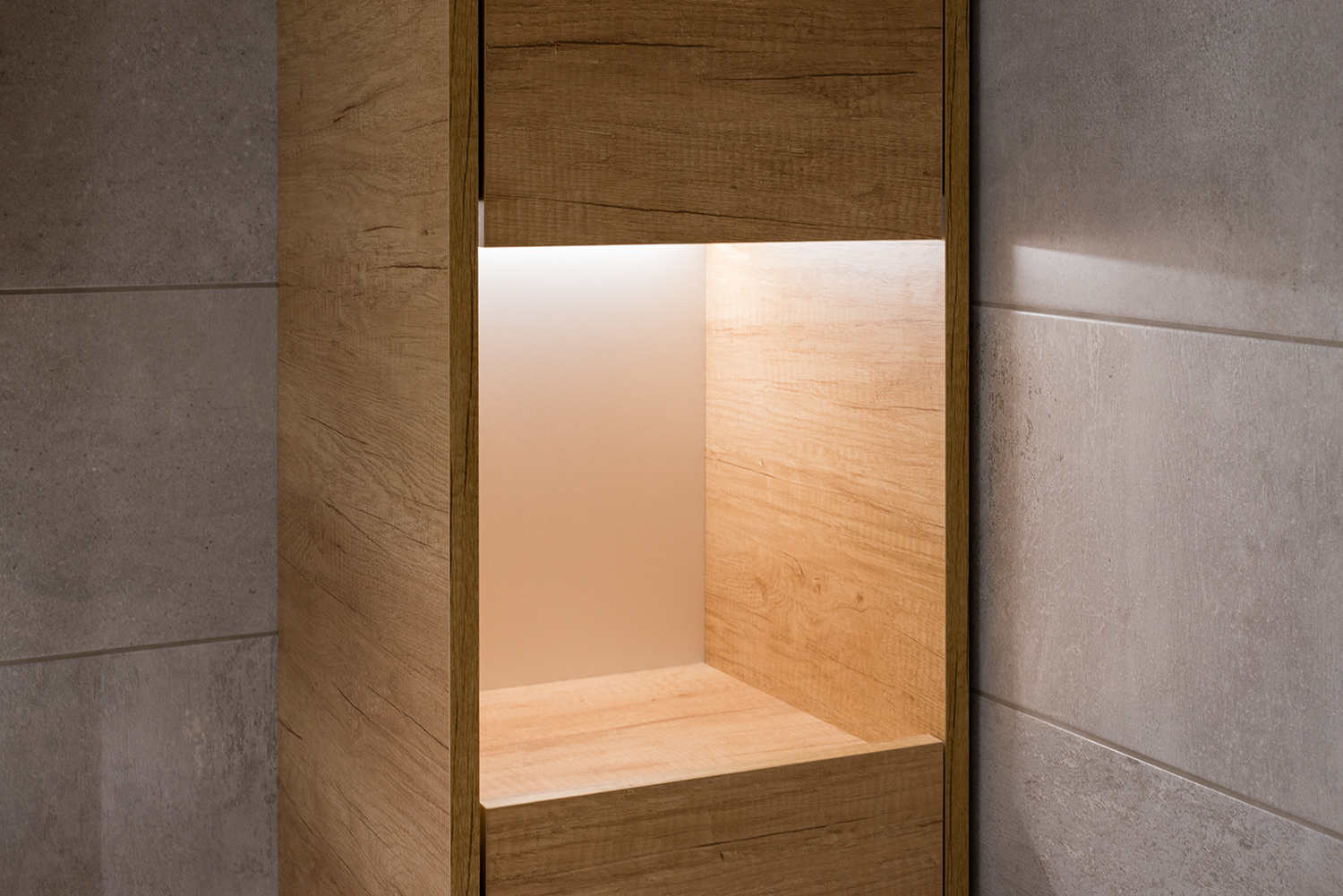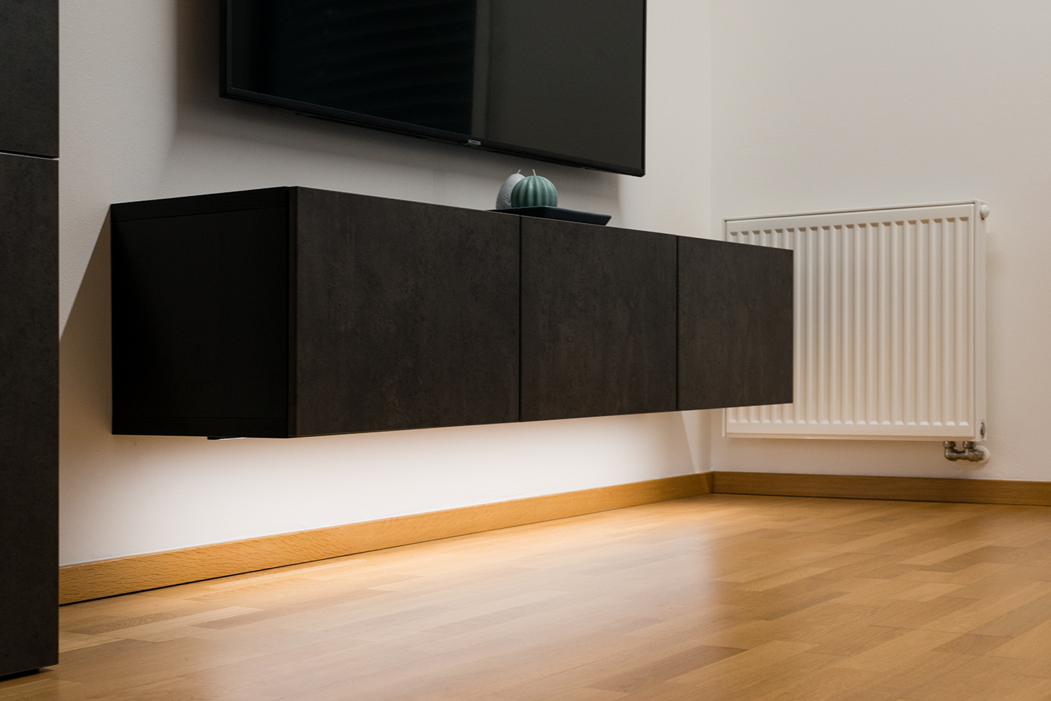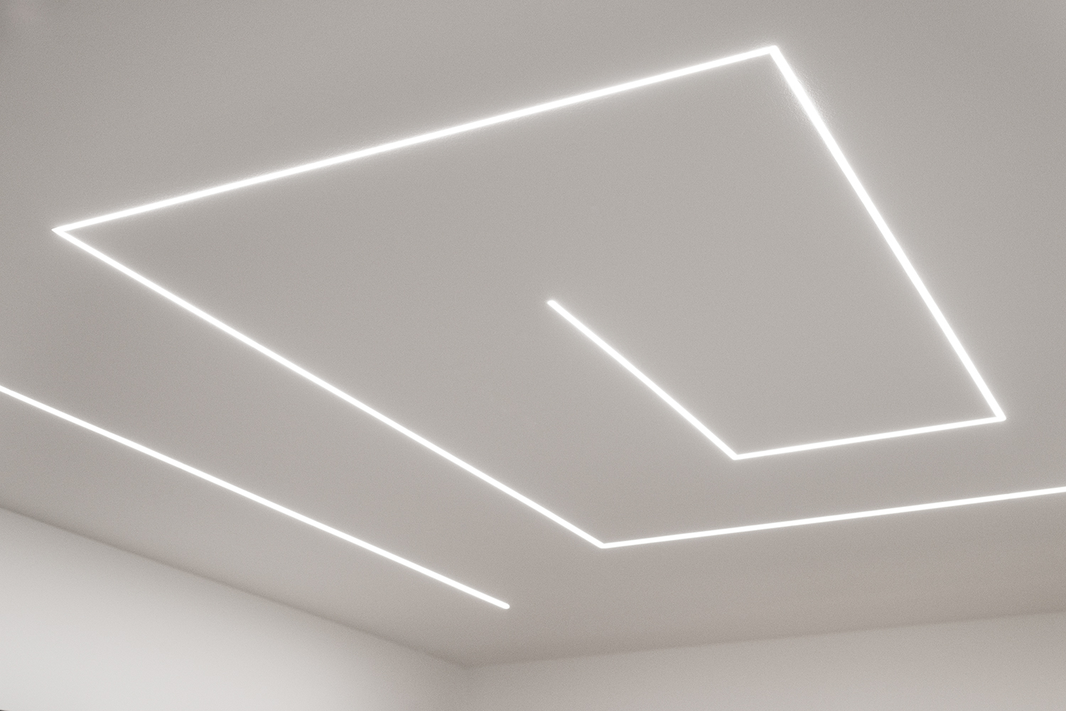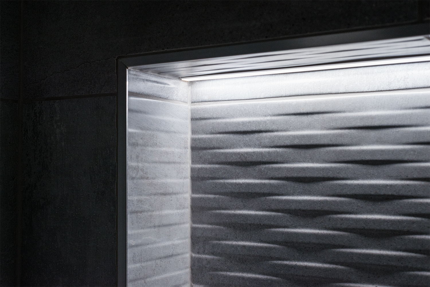 Der Flur wird mit dem LED-Unterputzprofil KLUŚ KOZEL beleuchtet. In weiteren Räumen, wie im Wohn- und im Schlafzimmer, wurden in der abgehängten Trockenbaudecke die dünnere LED-Leiste KLUŚ KOZEL-10 und das breitere LED-Profil KLUŚ KOZEL-50 verwendet. Die LED -Eckleiste mit einem Abstrahlwinkel von 45° KLUŚ 45-16 kam nicht nur für die Beleuchtung der Küchenzeile, der Regale und Schränkchen, sondern dank der möglichen Schutzart bis IP67 auch in der Dusche zum Einsatz.