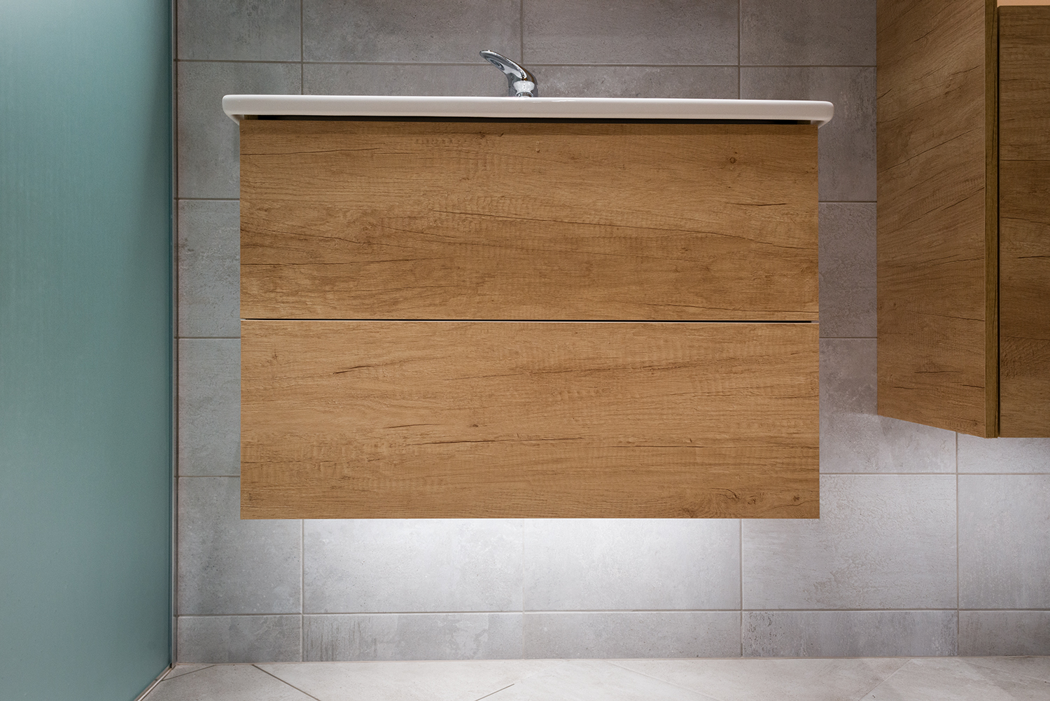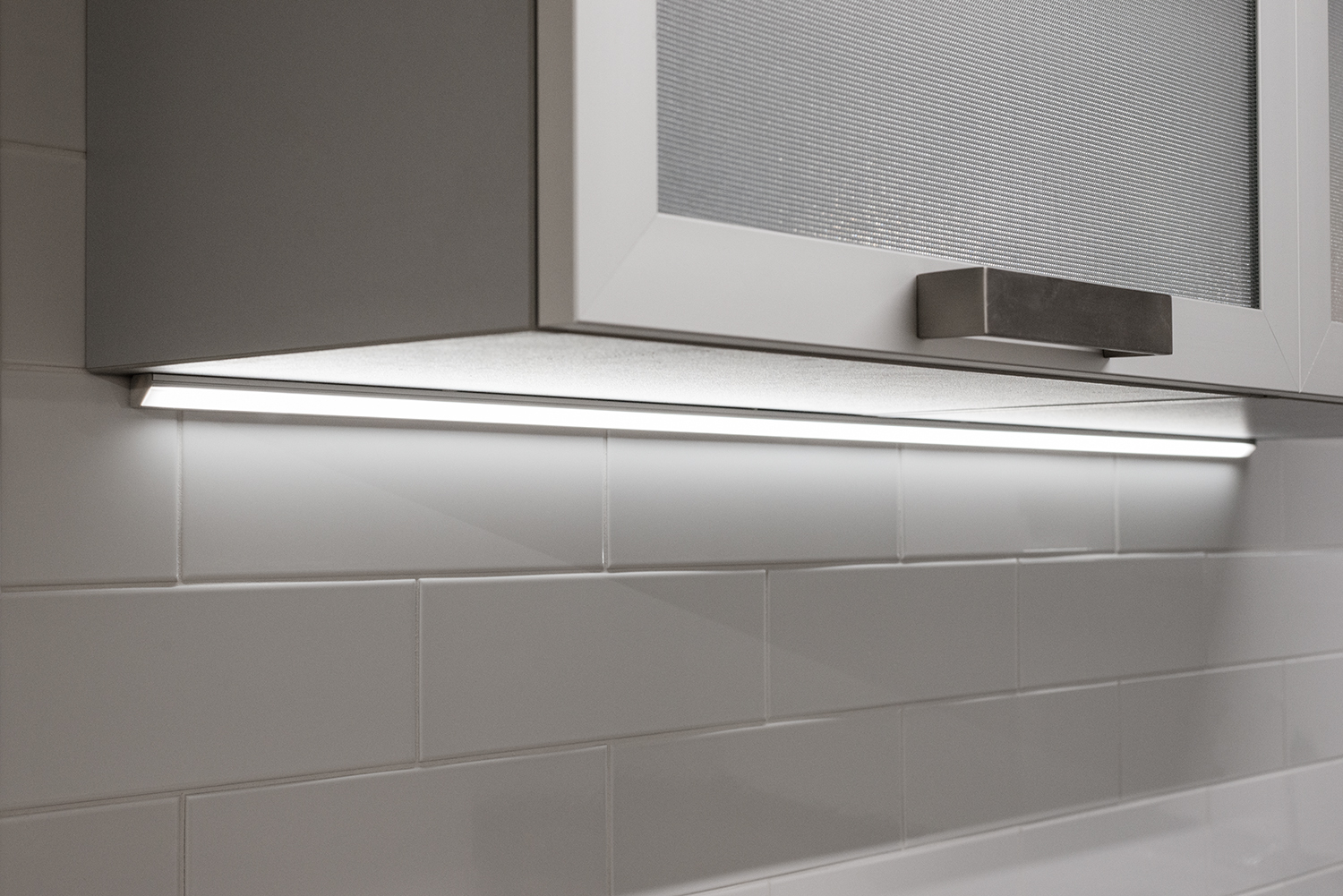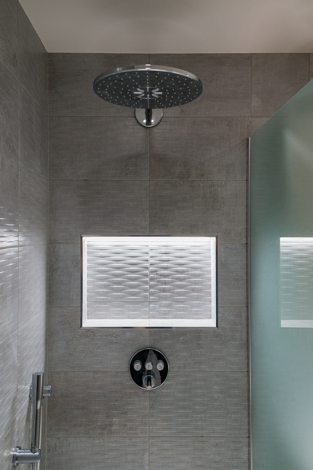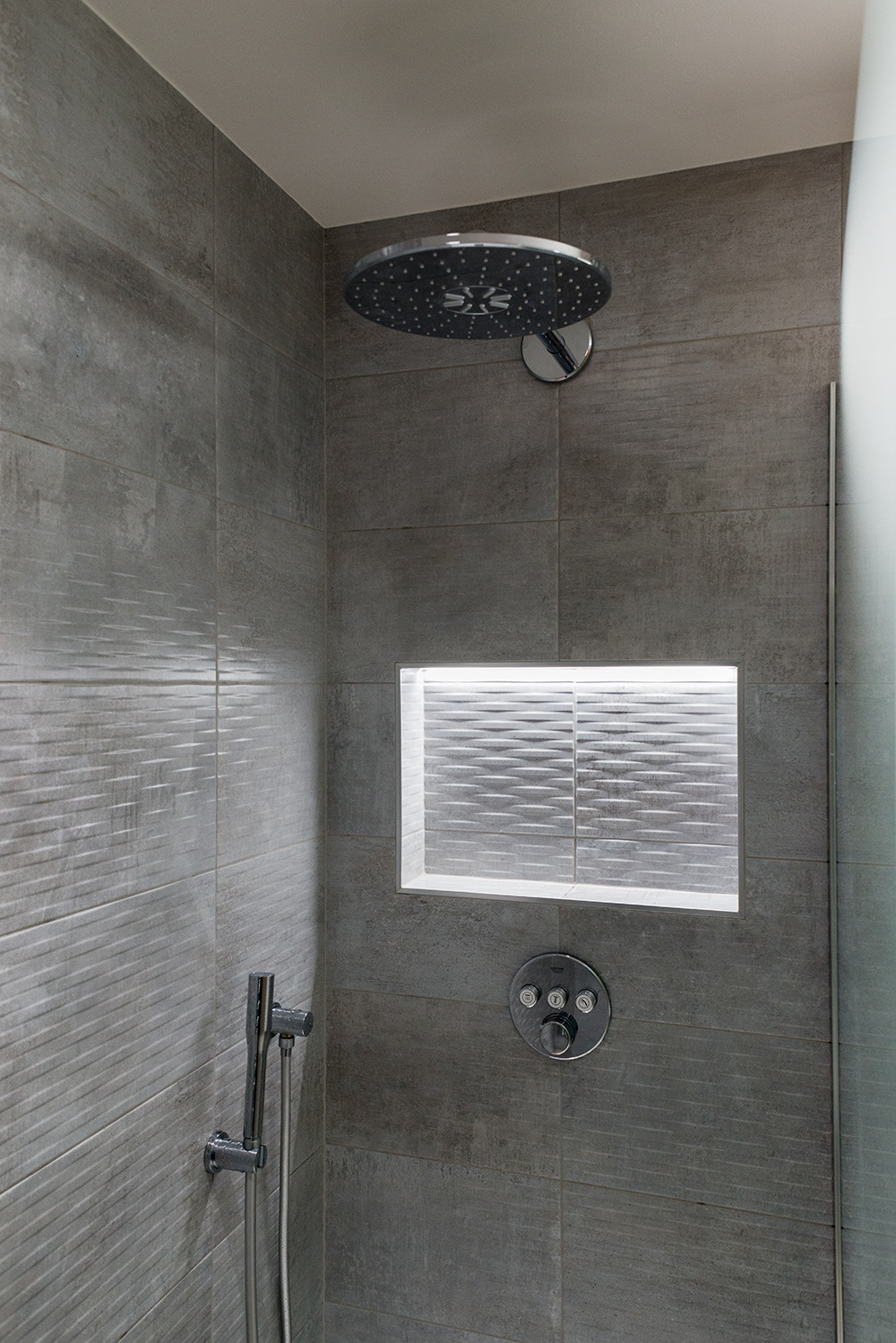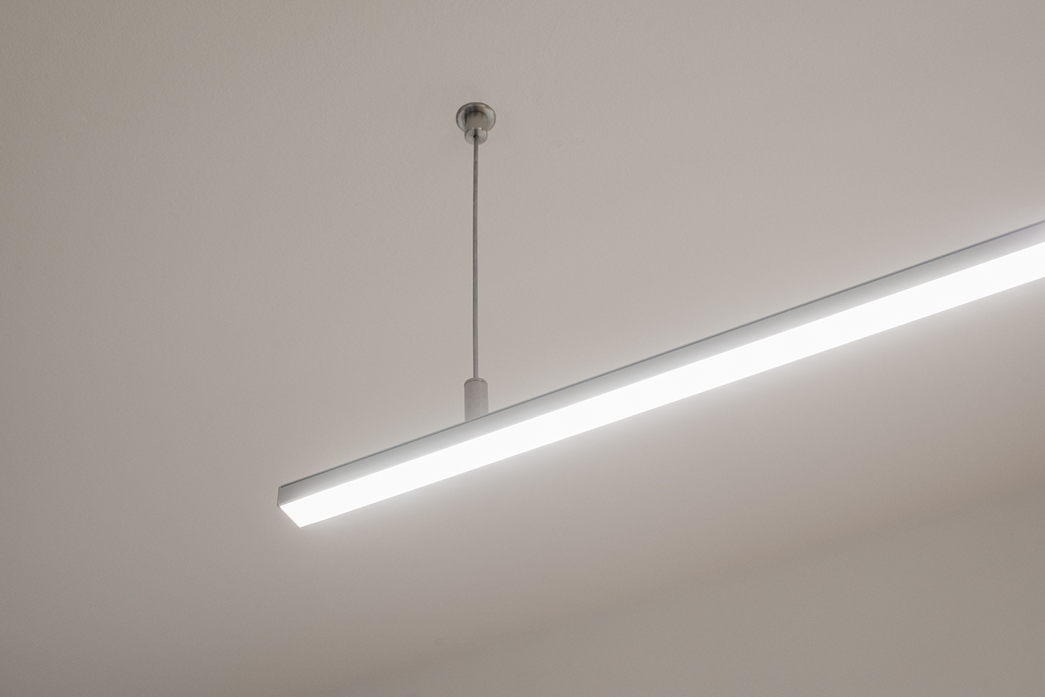 Der Flur wird mit dem LED-Unterputzprofil KLUŚ KOZEL beleuchtet. In weiteren Räumen, wie im Wohn- und im Schlafzimmer, wurden in der abgehängten Trockenbaudecke die dünnere LED-Leiste KLUŚ KOZEL-10 und das breitere LED-Profil KLUŚ KOZEL-50 verwendet. Die LED -Eckleiste mit einem Abstrahlwinkel von 45° KLUŚ 45-16 kam nicht nur für die Beleuchtung der Küchenzeile, der Regale und Schränkchen, sondern dank der möglichen Schutzart bis IP67 auch in der Dusche zum Einsatz.